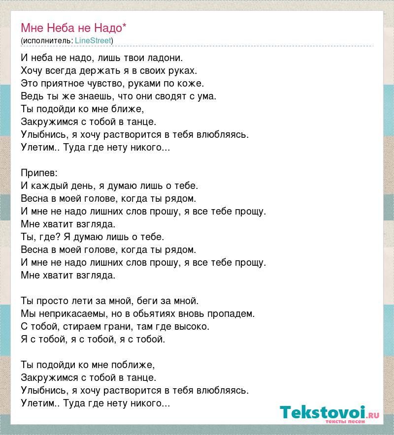 И неба не надо, лишь твои ладони. Хочу всегда держать я в своих руках. Это приятное чувство, руками по коже. Ведь ты же знаешь, что они сводят с ума. Ты подойди ко мне ближе, Закружимся с тобой в танце. Улыбнись, я хочу растворится в тебя влюбляясь. Улетим.. Туда где нету никого... Припев: И каждый день, я думаю лишь о тебе. Весна в моей голове, когда ты рядом. И мне не надо лишних слов прошу, я все тебе прощу. Мне хватит взгляда. Ты, где? Я думаю лишь о тебе. Весна в моей голове, когда ты рядом. И мне не надо лишних слов прошу, я все тебе прощу. Мне хватит взгляда. Ты просто лети за мной, беги за мной. Мы неприкасаемы, но в обьятиях вновь пропадем. С тобой, стираем грани, там где высоко. Я с тобой, я с тобой, я с тобой. Ты подойди ко мне поближе, Закружимся с тобой в танце. Улыбнись, я хочу растворится в тебя влюбляясь. Улетим.. Туда где нету никого...