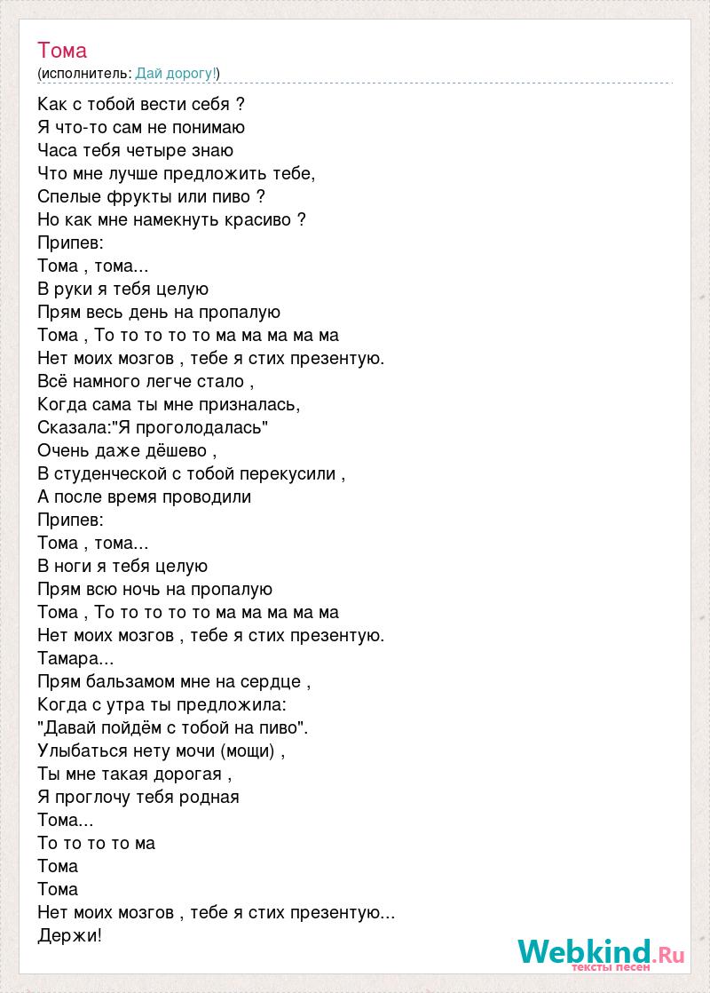 Как с тобой вести себя ? Я что-то сам не понимаю Часа тебя четыре знаю Что мне лучше предложить тебе, Спелые фрукты или пиво ? Но как мне намекнуть красиво ? Припев: Тома , тома... В руки я тебя целую Прям весь день на пропалую Тома , То то то то то ма ма ма ма ма Нет моих мозгов , тебе я стих презентую. Всё намного легче стало , Когда сама ты мне призналась, Сказала:"Я проголодалась" Очень даже дёшево , В студенческой с тобой перекусили , А после время проводили Припев: Тома , тома... В ноги я тебя целую Прям всю ночь на пропалую Тома , То то то то то ма ма ма ма ма Нет моих мозгов , тебе я стих презентую. Тамара... Прям бальзамом мне на сердце , Когда с утра ты предложила: "Давай пойдём с тобой на пиво". Улыбаться нету мочи (мощи) , Ты мне такая дорогая , Я проглочу тебя родная Тома... То то то то ма Тома Тома Нет моих мозгов , тебе я стих презентую... Держи!