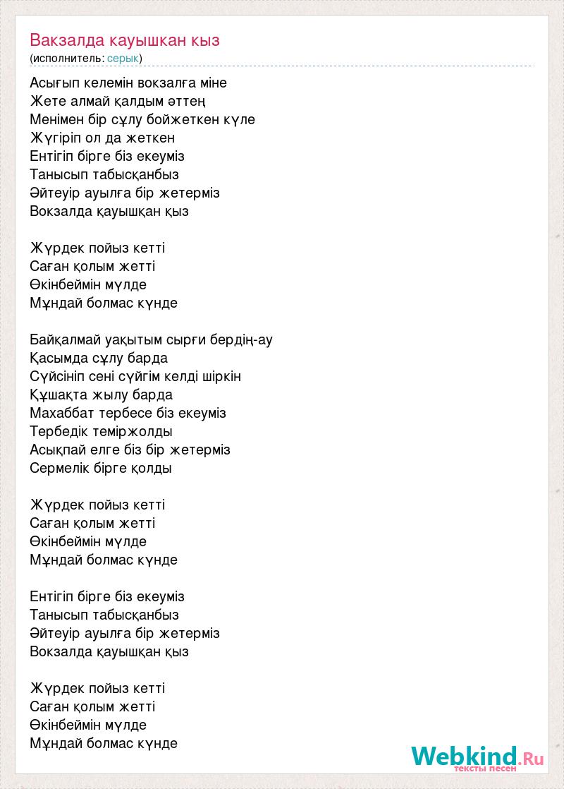 Асығып келемін вокзалға міне Жете алмай қалдым әттең Менімен бір сұлу бойжеткен күле Жүгіріп ол да жеткен Ентігіп бірге біз екеуміз Танысып табысқанбыз Әйтеуір ауылға бір жетерміз Вокзалда қауышқан қыз Жүрдек пойыз кетті Саған қолым жетті Өкінбеймін мүлде Мұндай болмас күнде Байқалмай уақытым сырғи бердің-ау Қасымда сұлу барда Сүйсініп сені сүйгім келді шіркін Құшақта жылу барда Махаббат тербесе біз екеуміз Тербедік теміржолды Асықпай елге біз бір жетерміз Сермелік бірге қолды Жүрдек пойыз кетті Саған қолым жетті Өкінбеймін мүлде Мұндай болмас күнде Ентігіп бірге біз екеуміз Танысып табысқанбыз Әйтеуір ауылға бір жетерміз Вокзалда қауышқан қыз Жүрдек пойыз кетті Саған қолым жетті Өкінбеймін мүлде Мұндай болмас күнде