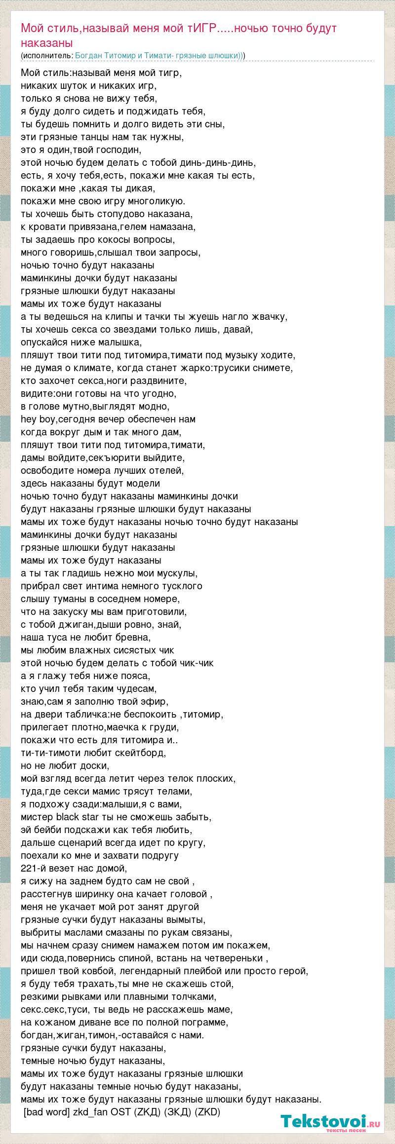 Мой стиль:называй меня мой тигр, никаких шуток и никаких игр, только я снова не вижу тебя, я буду долго сидеть и поджидать тебя, ты будешь помнить и долго видеть эти сны, эти грязные танцы нам так нужны, это я один,твой господин, этой ночью будем делать с тобой динь-динь-динь, есть, я хочу тебя,есть, покажи мне какая ты есть, покажи мне ,какая ты дикая, покажи мне свою игру многоликую. ты хочешь быть стопудово наказана, к кровати привязана,гелем намазана, ты задаешь про кокосы вопросы, много говоришь,слышал твои запросы, ночью точно будут наказаны маминкины дочки будут наказаны грязные шлюшки будут наказаны мамы их тоже будут наказаны а ты ведешься на клипы и тачки ты жуешь нагло жвачку, ты хочешь секса со звездами только лишь, давай, опускайся ниже малышка, пляшут твои тити под титомира,тимати под музыку ходите, не думая о климате, когда станет жарко:трусики снимете, кто захочет секса,ноги раздвините, видите:они готовы на что угодно, в голове мутно,выглядят модно, hey boy,сегодня вечер обеспечен нам когда вокруг дым и так много дам, пляшут твои тити под титомира,тимати, дамы войдите,секъюрити выйдите, освободите номера лучших отелей, здесь наказаны будут модели ночью точно будут наказаны маминкины дочки будут наказаны грязные шлюшки будут наказаны мамы их тоже будут наказаны ночью точно будут наказаны маминкины дочки будут наказаны грязные шлюшки будут наказаны мамы их тоже будут наказаны а ты так гладишь нежно мои мускулы, прибрал свет интима немного тусклого слышу туманы в соседнем номере, что на закуску мы вам приготовили, с тобой джиган,дыши ровно, знай, наша туса не любит бревна, мы любим влажных сисястых чик этой ночью будем делать с тобой чик-чик а я глажу тебя ниже пояса, кто учил тебя таким чудесам, знаю,сам я заполню твой эфир, на двери табличка:не беспокоить ,титомир, прилегает плотно,маечка к груди, покажи что есть для титомира и.. ти-ти-тимоти любит скейтборд, но не любит доски, мой взгляд всегда летит через телок плоских, туда,где секси мамис трясут телами, я подхожу сзади:малыши,я с вами, мистер black star ты не сможешь забыть, эй бейби подскажи как тебя любить, дальше сценарий всегда идет по кругу, поехали ко мне и захвати подругу 221-й везет нас домой, я сижу на заднем будто сам не свой , расстегнув ширинку она качает головой , меня не укачает мой рот занят другой грязные сучки будут наказаны вымыты, выбриты маслами смазаны по рукам связаны, мы начнем сразу снимем намажем потом им покажем, иди сюда,повернись спиной, встань на четвереньки , пришел твой ковбой, легендарный плейбой или просто герой, я буду тебя трахать,ты мне не скажешь стой, резкими рывками или плавными толчками, секс.секс,туси, ты ведь не расскажешь маме, на кожаном диване все по полной пограмме, богдан,жиган,тимон,-оставайся с нами. грязные сучки будут наказаны, темные ночью будут наказаны, мамы их тоже будут наказаны грязные шлюшки будут наказаны темные ночью будут наказаны, мамы их тоже будут наказаны грязные шлюшки будут наказаны. [bad word] zkd_fan OST (ZKД) (ЗКД) (ZKD)