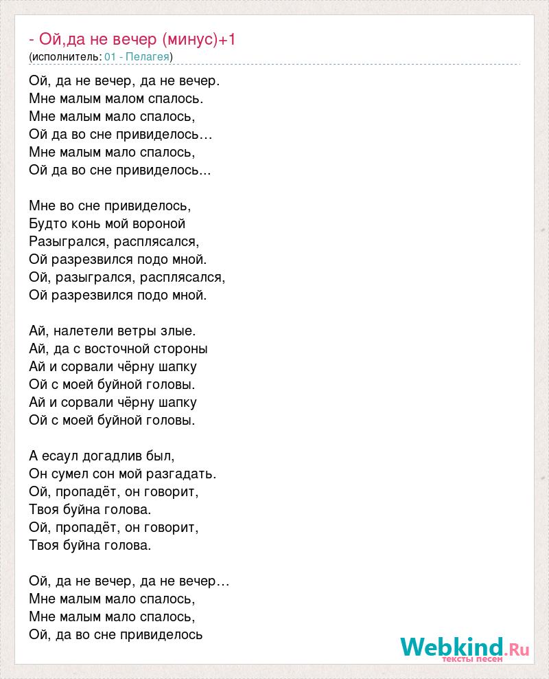 Ой, да не вечер, да не вечер. Мне малым малом спалось. Мне малым мало спалось, Ой да во сне привиделось… Мне малым мало спалось, Ой да во сне привиделось... Мне во сне привиделось, Будто конь мой вороной Разыгрался, расплясался, Ой разрезвился подо мной. Ой, разыгрался, расплясался, Ой разрезвился подо мной. Ай, налетели ветры злые. Ай, да с восточной стороны Ай и сорвали чёрну шапку Ой с моей буйной головы. Ай и сорвали чёрну шапку Ой с моей буйной головы. А есаул догадлив был, Он сумел сон мой разгадать. Ой, пропадёт, он говорит, Твоя буйна голова. Ой, пропадёт, он говорит, Твоя буйна голова. Ой, да не вечер, да не вечер… Мне малым мало спалось, Мне малым мало спалось, Ой, да во сне привиделось