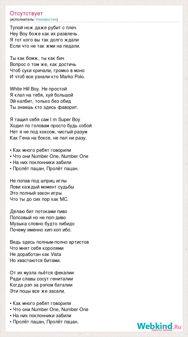 Тупой нож даже рубит с плеч Hey Boy боже как их развлечь Я тот кого вы так долго ждали Если что не так жми на педали. Ты как бомж, ты как бич Вопрос о том же, как достичь Чтоб суки кричали, громко в моно И чтоб все узнали кто Marko Polo. White Hill Boy. Не простой Я клал на тебя, хуй большой Эй калбит, только без обид Ты знаешь кто здесь фаворит. Я тащил себя сам I m Super Boy Ходил по головам просто будь собой Нет я не под коксом, чистый разум Как Гена на боксе, не пал ни разу. • Как много ребят говорили • Что они Number One, Number One • На них поклонники забили • Пролёт пацан, Пролёт пацан. Не попав под шприц иглы Лови каждый момент судьбы Это полный закон игры Что ты до сих пор как МС. Делаю бит потоками пиво Попсовый но не поп-диво Музыка словно будто либидо Почему именно хип-хоп ибо. Ведь здесь полным-полно артистов Что мнят себя королями Не доработан как Vista Но хвастаются битами. От их музла льётся фекалии Ради славы сосут гениталии Когда рэп за рэпом баталии Эти поцы все же засали. • Как много ребят говорили • Что они Number One, Number One • На них поклонники забили • Пролёт пацан, Пролёт пацан.