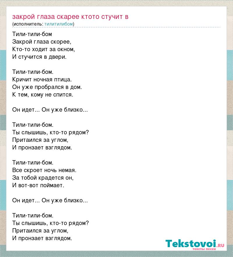 Тили-тили-бом Закрой глаза скорее, Кто-то ходит за окном, И стучится в двери. Тили-тили-бом. Кричит ночная птица. Он уже пробрался в дом. К тем, кому не спится. Он идет... Он уже близко... Тили-тили-бом. Ты слышишь, кто-то рядом? Притаился за углом, И пронзает взглядом. Тили-тили-бом. Все скроет ночь немая. За тобой крадется он, И вот-вот поймает. Он идет... Он уже близко... Тили-тили-бом. Ты слышишь, кто-то рядом? Притаился за углом, И пронзает взглядом.