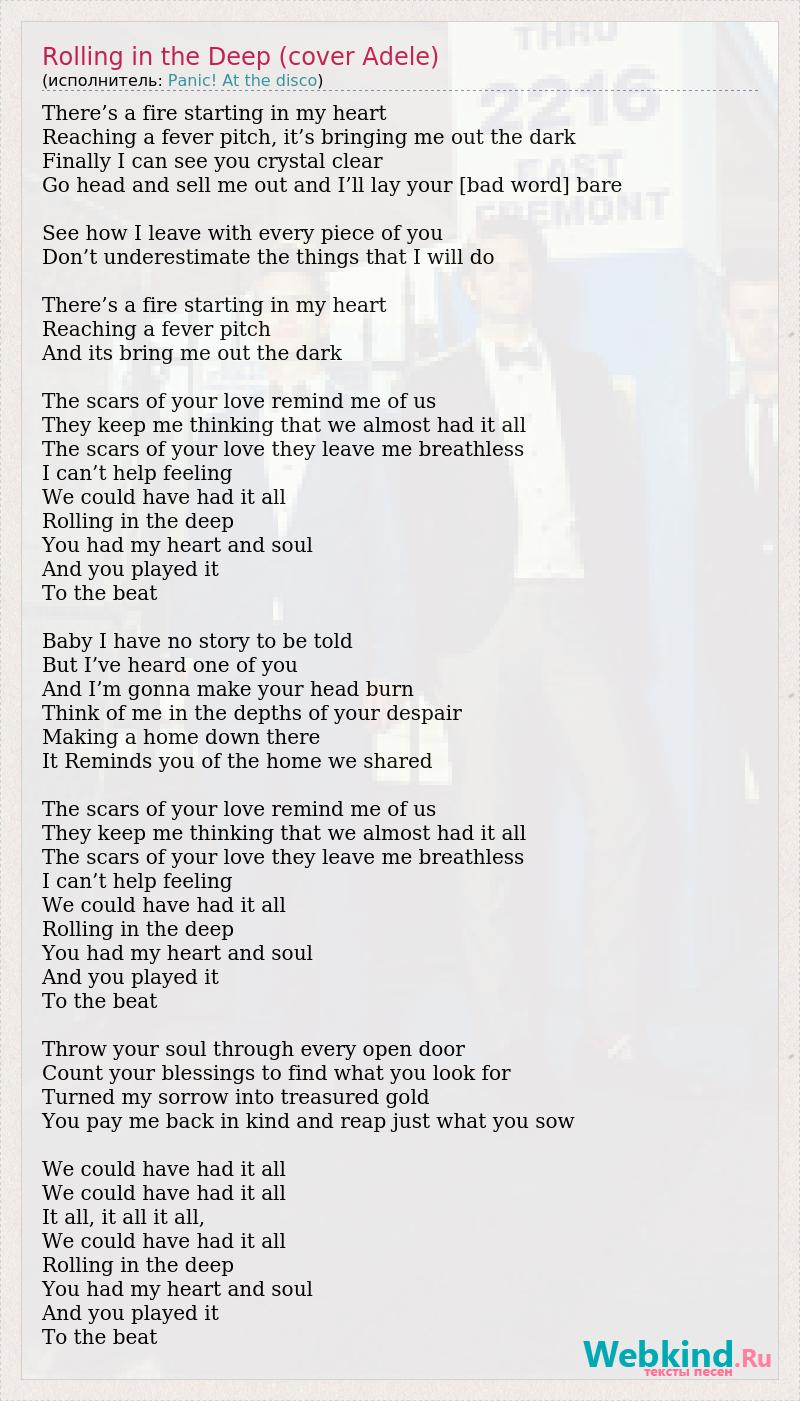 There’s a fire starting in my heart Reaching a fever pitch, it’s bringing me out the dark Finally I can see you crystal clear Go head and sell me out and I’ll lay your [bad word] bare See how I leave with every piece of you Don’t underestimate the things that I will do There’s a fire starting in my heart Reaching a fever pitch And its bring me out the dark The scars of your love remind me of us They keep me thinking that we almost had it all The scars of your love they leave me breathless I can’t help feeling We could have had it all Rolling in the deep You had my heart and soul And you played it To the beat Baby I have no story to be told But I’ve heard one of you And I’m gonna make your head burn Think of me in the depths of your despair Making a home down there It Reminds you of the home we shared The scars of your love remind me of us They keep me thinking that we almost had it all The scars of your love they leave me breathless I can’t help feeling We could have had it all Rolling in the deep You had my heart and soul And you played it To the beat Throw your soul through every open door Count your blessings to find what you look for Turned my sorrow into treasured gold You pay me back in kind and reap just what you sow We could have had it all We could have had it all It all, it all it all, We could have had it all Rolling in the deep You had my heart and soul And you played it To the beat