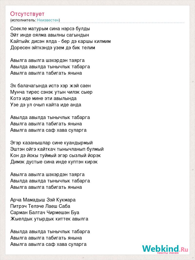 Соекле матурым сина нэрсэ булды Эйт инде оялма авылны сагындын Кайтыйк дисэн ялда - бер дэ каршы килмим Доресен эйткэндэ узем дэ бик телим Авылга авылга шэхэрдэн таярга Авылда авылда тынычлык табарга Авылга авылга табигать янына Эх балачагында истэ хэр жэй саен Мунча тирес сэнэк утын чилэк сыер Котэ иде мине эти авылында Узе дэ ул очып кайта иде анда Авылда авылда тынычлык табарга Авылга авылга табигать янына Авылга авылга саф хава суларга Эгэр казанышлар сине куандырмый Эштэн ойгэ кайткач тынычланып булмый Кон дэ йокы туймый эгэр сызлый йорэк Димэк дустые сина инде куптэн кирэк Авылга авылга шэхэрдэн таярга Авылда авылда тынычлык табарга Авылга авылга табигать янына Арча Мамадыш Зэй Кукмара Питрэч Телэче Лаеш Саба Сарман Балтач Чирмешэн Буа Жыелдык утырдык киттек авылга Авылда авылда тынычлык табарга Авылга авылга табигать янына Авылга авылга саф хава суларга