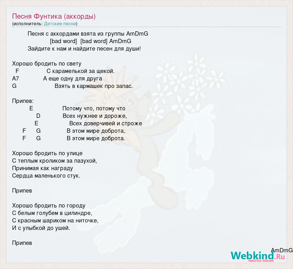 Песня с аккордами взята из группы AmDmG [bad word] [bad word] AmDmG Зайдите к нам и найдите песен для души! Хорошо бродить по свету F С карамелькой за щекой. A7 А еще одну для друга G Взять в кармашек про запас. Припев: E Потому что, потому что D Всех нужнее и дороже, E Всех доверчивей и строже F G В этом мире доброта, F G В этом мире доброта. Хорошо бродить по улице С теплым кроликом за пазухой, Принимая как награду Сердца маленького стук. Припев Хорошо бродить по городу С белым голубем в цилиндре, С красным шариком на ниточке, И с улыбкой до ушей. Припев AmDmG