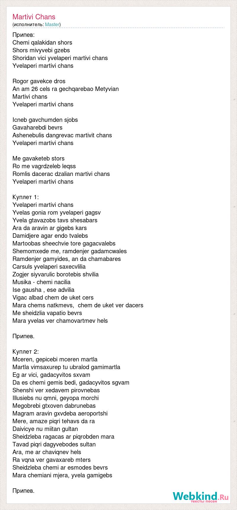 Припев: Chemi qalakidan shors Shors mivyvebi gzebs Shoridan vici yvelaperi martivi chans Yvelaperi martivi chans Rogor gavekce dros An am 26 cels ra gechqarebao Metyvian Martivi chans Yvelaperi martivi chans Icneb gavchumden sjobs Gavaharebdi bevrs Ashenebulis dangrevac martivit chans Yvelaperi martivi chans Me gavaketeb stors Ro me vagrdzeleb leqss Romlis dacerac dzalian martivi chans Yvelaperi martivi chans Куплет 1: Yvelaperi martivi chans Yvelas gonia rom yvelaperi gagsv Yvela gtavazobs tavs shesabars Ara da aravin ar gigebs kars Damidjere agar endo tvalebs Martoobas sheechvie tore gagacvalebs Shemomxede me, ramdenjer gadamcwales Ramdenjer gamyides, an da chamabares Carsuls yvelaperi saxecvlilia Zogjer siyvarulic borotebis shvilia Musika - chemi nacilia Ise gausha , ese advilia Vigac albad chem de uket cers Mara chems natkmevs, chem de uket ver dacers Me sheidzlia vapatio bevrs Mara yvelas ver chamovartmev hels Припев. Куплет 2: Mceren, gepicebi mceren martla Martla vimsaxurep tu ubralod gamimartla Eg ar vici, gadacyvitos sxvam Da es chemi gemis bedi, gadacyvitos sgvam Shenshi ver xedavem pirovnebas Illusiebs nu qmni, geyopa morchi Megobrebi gtxoven dabrunebas Magram aravin gxvdeba aeroportshi Mere, amaze piqri tehavs da ra Daivicye nu miitan gultan Sheidzleba ragacas ar piqrobden mara Tavad piqri dagyvebodes sultan Ara, me ar chaviqnev hels Ra vqna ver gavaxareb mters Sheidzleba chemi ar esmodes bevrs Mara chemiani mjera, yvela gamigebs Припев.