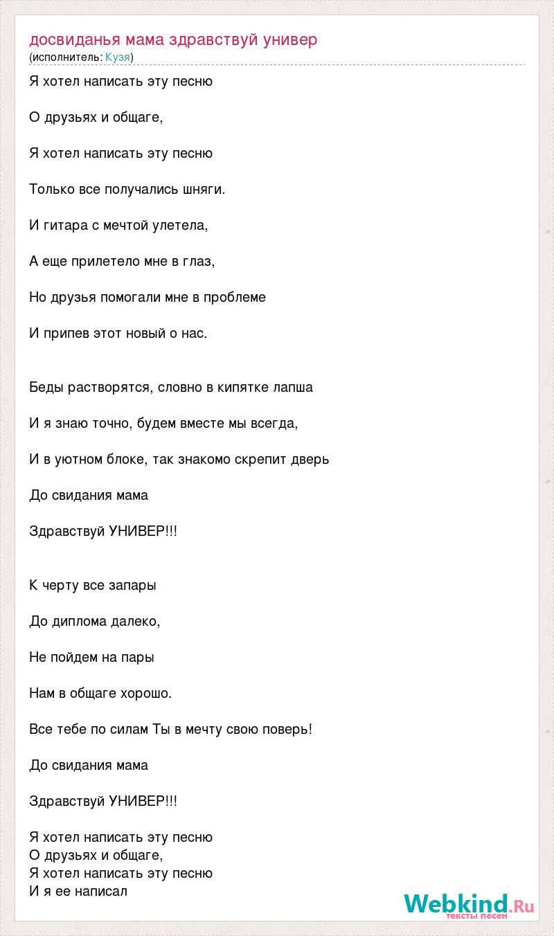 Я хотел написать эту песню О друзьях и общаге, Я хотел написать эту песню Только все получались шняги. И гитара с мечтой улетела, А еще прилетело мне в глаз, Но друзья помогали мне в проблеме И припев этот новый о нас. Беды растворятся, словно в кипятке лапша И я знаю точно, будем вместе мы всегда, И в уютном блоке, так знакомо скрепит дверь До свидания мама Здравствуй УНИВЕР!!! К черту все запары До диплома далеко, Не пойдем на пары Нам в общаге хорошо. Все тебе по силам Ты в мечту свою поверь! До свидания мама Здравствуй УНИВЕР!!! Я хотел написать эту песню О друзьях и общаге, Я хотел написать эту песню И я ее написал