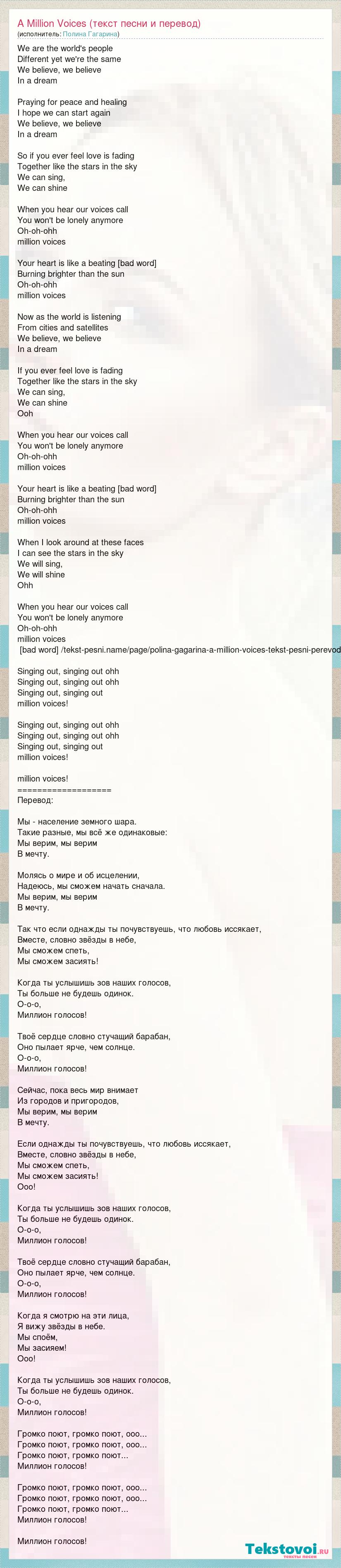 We are the world's people Different yet we're the same We believe, we believe In a dream Praying for peace and healing I hope we can start again We believe, we believe In a dream So if you ever feel love is fading Together like the stars in the sky We can sing, We can shine When you hear our voices call You won't be lonely anymore Oh-oh-ohh million voices Your heart is like a beating [bad word] Burning brighter than the sun Oh-oh-ohh million voices Now as the world is listening From cities and satellites We believe, we believe In a dream If you ever feel love is fading Together like the stars in the sky We can sing, We can shine Ooh When you hear our voices call You won't be lonely anymore Oh-oh-ohh million voices Your heart is like a beating [bad word] Burning brighter than the sun Oh-oh-ohh million voices When I look around at these faces I can see the stars in the sky We will sing, We will shine Ohh When you hear our voices call You won't be lonely anymore Oh-oh-ohh million voices [bad word] /tekst-pesni.name/page/polina-gagarina-a-million-voices-tekst-pesni-perevod Singing out, singing out ohh Singing out, singing out ohh Singing out, singing out million voices! Singing out, singing out ohh Singing out, singing out ohh Singing out, singing out million voices! million voices! =================== Перевод: Мы - население земного шара. Такие разные, мы всё же одинаковые: Мы верим, мы верим В мечту. Молясь о мире и об исцелении, Надеюсь, мы сможем начать сначала. Мы верим, мы верим В мечту. Так что если однажды ты почувствуешь, что любовь иссякает, Вместе, словно звёзды в небе, Мы сможем спеть, Мы сможем засиять! Когда ты услышишь зов наших голосов, Ты больше не будешь одинок. О-о-о, Миллион голосов! Твоё сердце словно стучащий барабан, Оно пылает ярче, чем солнце. О-о-о, Миллион голосов! Сейчас, пока весь мир внимает Из городов и пригородов, Мы верим, мы верим В мечту. Если однажды ты почувствуешь, что любовь иссякает, Вместе, словно звёзды в небе, Мы сможем спеть, Мы сможем засиять! Ооо! Когда ты услышишь зов наших голосов, Ты больше не будешь одинок. О-о-о, Миллион голосов! Твоё сердце словно стучащий барабан, Оно пылает ярче, чем солнце. О-о-о, Миллион голосов! Когда я смотрю на эти лица, Я вижу звёзды в небе. Мы споём, Мы засияем! Ooo! Когда ты услышишь зов наших голосов, Ты больше не будешь одинок. О-о-о, Миллион голосов! Громко поют, громко поют, ооо... Громко поют, громко поют, ооо... Громко поют, громко поют... Миллион голосов! Громко поют, громко поют, ооо... Громко поют, громко поют, ооо... Громко поют, громко поют... Миллион голосов! Миллион голосов!