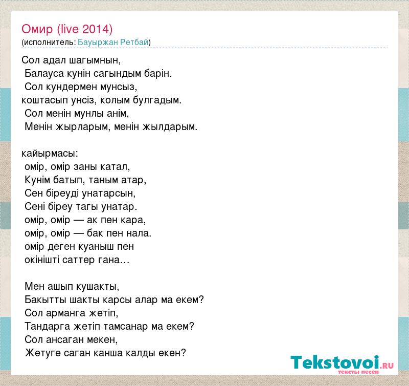 Сол адал шагымнын, Балауса кунін сагындым барін. Сол кундермен мунсыз, коштасып унсіз, колым булгадым. Сол менін мунлы анім, Менін жырларым, менін жылдарым. кайырмасы: омір, омір заны катал, Кунім батып, таным атар, Сен біреуді унатарсын, Сені біреу тагы унатар. омір, омір — ак пен кара, омір, омір — бак пен нала. омір деген куаныш пен окінішті саттер гана… Мен ашып кушакты, Бакытты шакты карсы алар ма екем? Сол арманга жетіп, Тандарга жетіп тамсанар ма екем? Сол ансаган мекен, Жетуге саган канша калды екен?