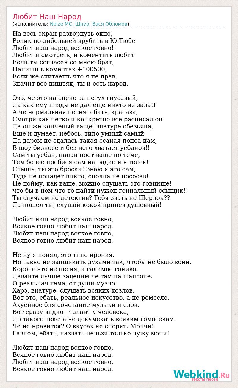 На весь экран развернуть окно, Ролик по-дибольней врубить в Ю-Тюбе Любит наш народ всякое говно!! Любит и смотреть, и коментить любит Если ты согласен со мною брат, Напиши в коментах +100500, Если же считаешь что я не прав, Значит все ништяк, ты и есть народ. Эээ, че это на сцене за петух гнусавый, Да как ему пизды не дал еще никто из зала!! А че нормальная песня, ебать, красава, Смотри как четко и конкретно все расписал он Да он же конченый ваще, внатуре обезьяна, Еще и думает, небось, типо умный самый Да даром не сдалась такая ссаная попса нам, В шоу бизнесе и без него хватает уебанов!! Сам ты уебан, пацан поет ваще по теме, Тем более пробися сам на радио и в телек! Слышь, ты это бросай! Знаю я это сам, Туда не попадет никто, сполна не пососав! Не пойму, как ваще, можно слушать это говнище! что бы в нем что то найти нужен гениальный ссыщик!! Ты случаем не детектив? Тебя звать не Шерлок?? Да пошел ты, слушай кокой припев душевный! Любит наш народ всякое говно, Всякое говно любит наш народ. Любит наш народ всякое говно, Всякое говно любит наш народ. Не ну я понял, это типо ирония. Но гавно не запшикать духами так, чтобы не было вони. Короче это не песня, а галимое гониво. Давайте лучше заценим че там на шансоне. О реальная тема, от души музло. Харэ, внатуре, слушать всяких козлов. Вот это, ебать, реальное искусство, а не ремесло. Ахуенное бля сочетание музыки и слов. Вот сразу видно - талант у человека, До такого текста не докумекать всяким гомосекам. Че не нравится? О вкусах не спорят. Молчи! Гавном, ебать, назвать нельзя только лужу мочи! Любит наш народ всякое говно, Всякое говно любит наш народ. Любит наш народ всякое говно, Всякое говно любит наш народ.