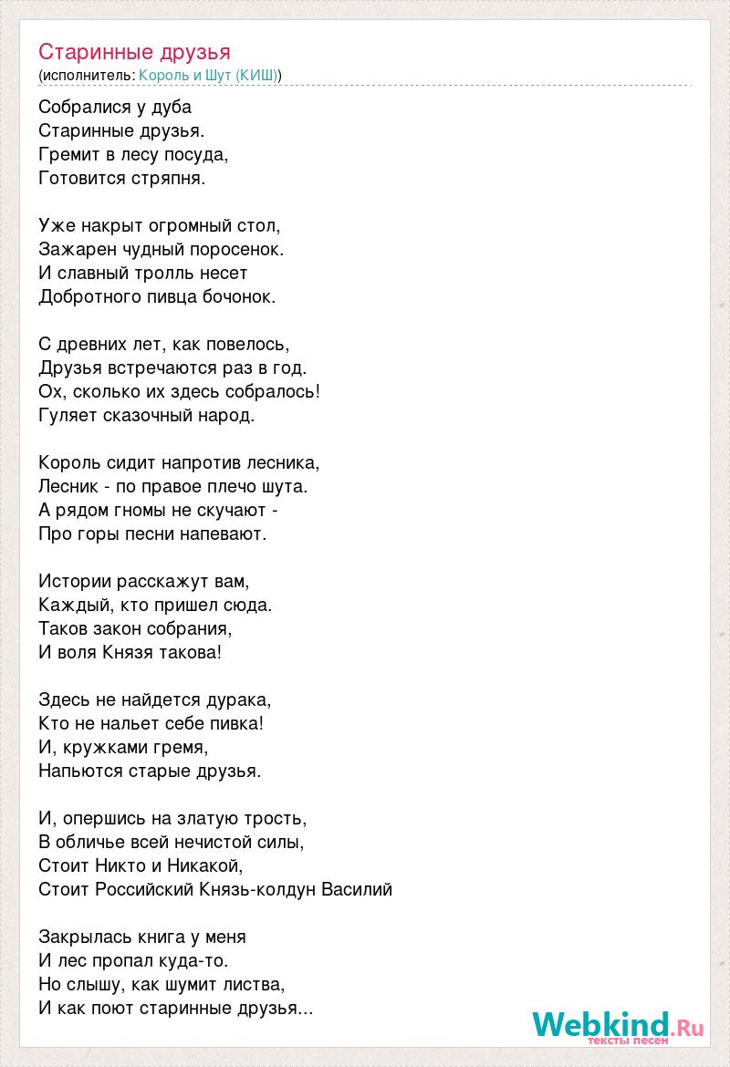 Собралися у дуба Старинные друзья. Гремит в лесу посуда, Готовится стряпня. Уже накрыт огромный стол, Зажарен чудный поросенок. И славный тролль несет Добротного пивца бочонок. С древних лет, как повелось, Друзья встречаются раз в год. Ох, сколько их здесь собралось! Гуляет сказочный народ. Король сидит напротив лесника, Лесник - по правое плечо шута. А рядом гномы не скучают - Про горы песни напевают. Истории расскажут вам, Каждый, кто пришел сюда. Таков закон собрания, И воля Князя такова! Здесь не найдется дурака, Кто не нальет себе пивка! И, кружками гремя, Напьются старые друзья. И, опершись на златую трость, В обличье всей нечистой силы, Стоит Никто и Никакой, Стоит Российский Князь-колдун Василий Закрылась книга у меня И лес пропал куда-то. Но слышу, как шумит листва, И как поют старинные друзья...