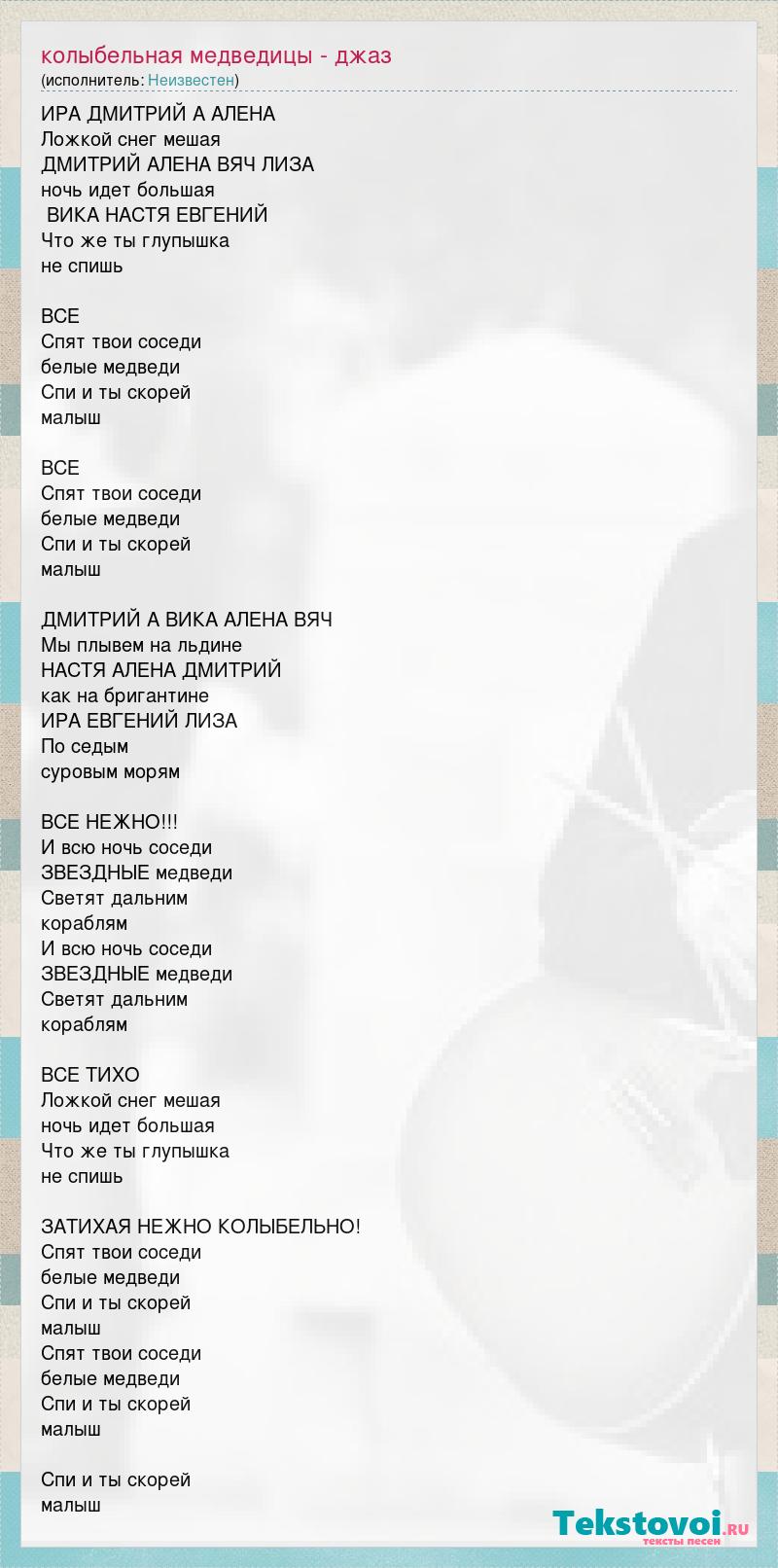 ИРА ДМИТРИЙ А АЛЕНА Ложкой снег мешая ДМИТРИЙ АЛЕНА ВЯЧ ЛИЗА ночь идет большая ВИКА НАСТЯ ЕВГЕНИЙ Что же ты глупышка не спишь ВСЕ Спят твои соседи белые медведи Спи и ты скорей малыш ВСЕ Спят твои соседи белые медведи Спи и ты скорей малыш ДМИТРИЙ А ВИКА АЛЕНА ВЯЧ Мы плывем на льдине НАСТЯ АЛЕНА ДМИТРИЙ как на бригантине ИРА ЕВГЕНИЙ ЛИЗА По седым суровым морям ВСЕ НЕЖНО!!! И всю ночь соседи ЗВЕЗДНЫЕ медведи Светят дальним кораблям И всю ночь соседи ЗВЕЗДНЫЕ медведи Светят дальним кораблям ВСЕ ТИХО Ложкой снег мешая ночь идет большая Что же ты глупышка не спишь ЗАТИХАЯ НЕЖНО КОЛЫБЕЛЬНО! Спят твои соседи белые медведи Спи и ты скорей малыш Спят твои соседи белые медведи Спи и ты скорей малыш Спи и ты скорей малыш