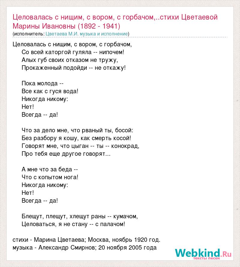 А как ты думаешь, о чем песня "Целовалась с нищим, с вором, с горбачом,..стихи Цветаевой Марины Ивановны (1892 " ?