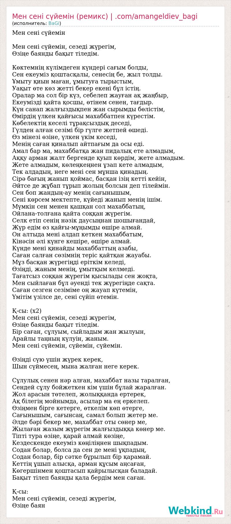 Мен сені сүйемін Мен сені сүйемін, сезеді жүрегім, Өзіңе баянды бақыт тіледім. Көктемнің күлімдеген күндері сағым болды, Сен екеуміз қоштасқалы, сенесің бе, жыл толды. Ұмыту қиын маған, ұмытуға тырыстым, Уақыт өте көз жетті бекер екені бұл істің. Оралар ма сол бір күз, себелеп жауған ақ жаңбыр, Екеумізді қайта қосшы, өтінем сенен, тағдыр. Күн санап жалғыздықпен жан сырымды бөлістім, Өмірдің үлкен қайғысы махаббатпен күрестім. Көбелектің кеселі тұрақсыздық деседі, Гүлден алған сезімі бір гүлге жетпей өшеді. Өз мінезі өзіне, үлкен үкім кеседі, Менің саған қиналып айтпағым да осы еді. Амал бар ма, махаббатқа жан пидалық ете алмадым, Аққу арман жалт бергенде қуып көрдім, жете алмадым. Жете алмадым, көлеңкеңнен ұзап кете алмадым, Тек алдадың, неге мені сен мұнша қинадың. Сірә бағың жанып қоймас, басқан ізің кетті кейін, Әйтсе де жұбап тұрып жолың болсын деп тілеймін. Сен боп жандың-ау менің сағынышым, Сені көрсем мектепте, күйеді жанып менің ішім. Мүмкін сен менен қашқан сол махаббатың, Ойлана-толғана қайта соққан жүрегім. Селк етіп сенің нәзік даусыңнан шошығандай, Жүр едім өз қайғы-мұңымды өшіре алмай. Он алтыда мені алдап кеткен махаббатым, Кінәсін әлі күнге кешіре, өшіре алмай. Күнде мені қинайды махаббаттың азабы, Саған салған сөзімнің теріс қайтқан жауабы. Мұз басқан жүрегіңді еріткім келеді, Өзіңді, жаным менің, ұмытқым келмеді. Тағатсыз соққан жүрегім қысылады сен жоқта, Мен сыйлаған бұл әуенді тек жүрегіңде сақта. Саған сезген сезіміме оң жауап күтемін, Үмітім үзілсе де, сені сүйіп өтемін. Қ-сы: (x2) Мен сені сүйемін, сезеді жүрегім, Өзіңе баянды бақыт тіледім. Бір саған, сұлуым, сыйладым жан жылуын, Арайлы таңның күлуін, жаным. Мен сені сүйемін, сүйемін, сүйемін. Өзіңді сүю үшін жүрек керек, Шын сүймесең, мына жалған неге керек. Сұлулық сенен нәр алған, махаббат назы таралған, Сендей сұлу бойжеткен кім үшін бұлай жаралған. Жол арасын төтелеп, жолыққанда ертерек, Ақ білегің мойнымда, асылар ма ең еркелеп. Өзіңмен бірге кетерге, өткелім көп өтерге, Сағынышым, сағынсаң, самал болып жетер ме. Әлде бәрі бекер ме, махаббат оты сөнер ме, Жылаған жазым жүрегім жалғыздыққа көнер ме. Тіпті тура өзіңе, қарай алмай көзіңе, Кездескенде екеуміз көңіліңнен шықпадым. Содан болар, болса да сен де мені ұқпадың, Содан болар, бір сәтке бұрылып бір қарамай. Кеттің ұшып алысқа, арман құсым аңсаған, Көгершінмен қоштасып қайрылысқан баладай. Бақыт тілеп баянды қала бердім мен саған. Қ-сы: Мен сені сүйемін, сезеді жүрегім, Өзіңе баян