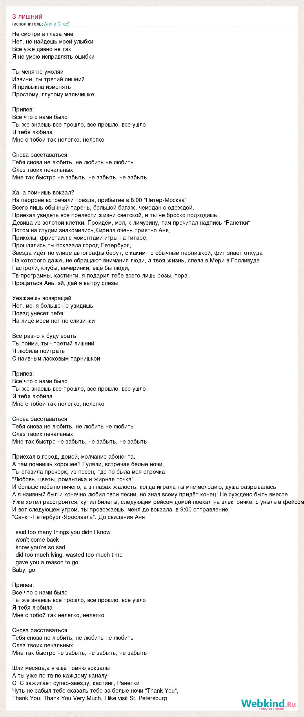Не смотри в глаза мне Нет, не найдешь моей улыбки Все уже давно не так Я не умею исправлять ошибки Ты меня не умоляй Извини, ты третий лишний Я привыкла изменять Простому, глупому мальчишке Припев: Все что с нами было Ты же знаешь все прошло, все прошло, все ушло Я тебя любила Мне с тобой так нелегко, нелегко Снова расставаться Тебя снова не любить, не любить не любить Слез твоих печальных Мне так быстро не забыть, не забыть, не забыть Ха, а помнишь вокзал? На перроне встречали поезда, прибытие в 8:00 "Питер-Москва" Всего лишь обычный парень, большой багаж, чемодан с одеждой, Приехал увидеть все прелести жизни светской, и ты не броско подходишь, Девица из золотой клетки. Пройдём, мол, к лимузину, там прочитал надпись "Ранетки" Потом на студии знакомились,Кирилл очень приятно Аня, Приколы, фристайл с моментами игры на гитаре, Прошлялись,ты показала город Петербург, Звезда идёт по улице автографы берут, с каким-то обычным парнишкой, фиг знает откуда На которого даже, не обращают внимания люди, а твоя жизнь, спела в Мери в Голливуде Гастроли, клубы, вечеринки, ещё бы люди, Тв-программы, кастинги, я подарил тебе всего лишь розы, пора Прощаться Ань, эй, дай я вытру слёзы Уезжаешь возвращай Нет, меня больше не увидишь Поезд унесет тебя На лице моем нет не слизинки Все равно я буду врать Ты пойми, ты - третий лишний Я любила поиграть С наивным ласковым парнишкой Припев: Все что с нами было Ты же знаешь все прошло, все прошло, все ушло Я тебя любила Мне с тобой так нелегко, нелегко Снова расставаться Тебя снова не любить, не любить не любить Слез твоих печальных Мне так быстро не забыть, не забыть, не забыть Приехал в город, домой, молчание абонента. А там помнишь хорошее? Гуляли, встречая белые ночи, Ты ставила прочерк, из песен, где-то была моя строчка "Любовь, цветы, романтика и жирная точка" И больше небыло ничего, а в глазах жалость, когда играла ты мне мелодию, душа разрывалась А я наивный был и конечно любил твои песни, но знал всему придёт конец! Не суждено быть вместе Уже хотел расстроится, купил билеты, следующим рейсом домой поехал на электричке, с унылым фейсом И вот следующем утром, ты провожаешь, меня до вокзала, в 9:00 отправление, "Санкт-Петербург-Ярославль". До свидания Аня I said too many things you didn’t know I won’t come back I know you’re so sad I did too much lying, wasted too much time I gave you a reason to go Baby, go Припев: Все что с нами было Ты же знаешь все прошло, все прошло, все ушло Я тебя любила Мне с тобой так нелегко, нелегко Снова расставаться Тебя снова не любить, не любить не любить Слез твоих печальных Мне так быстро не забыть, не забыть, не забыть Шли месяца,а я ещё помню вокзалы А ты уже по тв по каждому каналу СТС зажигает супер-звезду, кастинг, Ранетки Чуть не забыл тебе сказать тебе за белые ночи "Thank You", Thank You, Thank You Very Much, I like visit St. Petersburg