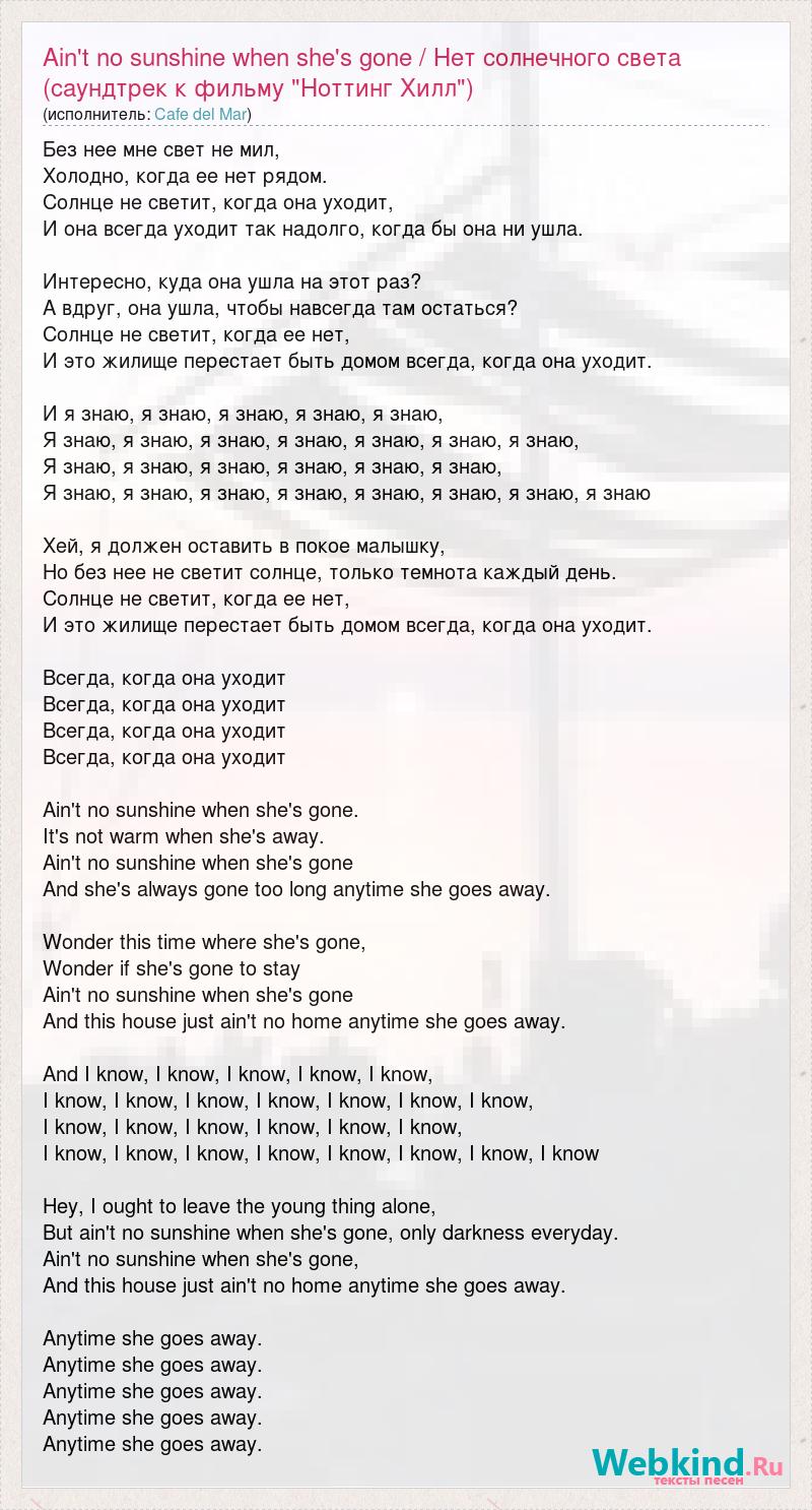 Без нее мне свет не мил, Холодно, когда ее нет рядом. Солнце не светит, когда она уходит, И она всегда уходит так надолго, когда бы она ни ушла. Интересно, куда она ушла на этот раз? А вдруг, она ушла, чтобы навсегда там остаться? Солнце не светит, когда ее нет, И это жилище перестает быть домом всегда, когда она уходит. И я знаю, я знаю, я знаю, я знаю, я знаю, Я знаю, я знаю, я знаю, я знаю, я знаю, я знаю, я знаю, Я знаю, я знаю, я знаю, я знаю, я знаю, я знаю, Я знаю, я знаю, я знаю, я знаю, я знаю, я знаю, я знаю, я знаю Хей, я должен оставить в покое малышку, Но без нее не светит солнце, только темнота каждый день. Солнце не светит, когда ее нет, И это жилище перестает быть домом всегда, когда она уходит. Всегда, когда она уходит Всегда, когда она уходит Всегда, когда она уходит Всегда, когда она уходит Ain't no sunshine when she's gone. It's not warm when she's away. Ain't no sunshine when she's gone And she's always gone too long anytime she goes away. Wonder this time where she's gone, Wonder if she's gone to stay Ain't no sunshine when she's gone And this house just ain't no home anytime she goes away. And I know, I know, I know, I know, I know, I know, I know, I know, I know, I know, I know, I know, I know, I know, I know, I know, I know, I know, I know, I know, I know, I know, I know, I know, I know, I know Hey, I ought to leave the young thing alone, But ain't no sunshine when she's gone, only darkness everyday. Ain't no sunshine when she's gone, And this house just ain't no home anytime she goes away. Anytime she goes away. Anytime she goes away. Anytime she goes away. Anytime she goes away. Anytime she goes away.