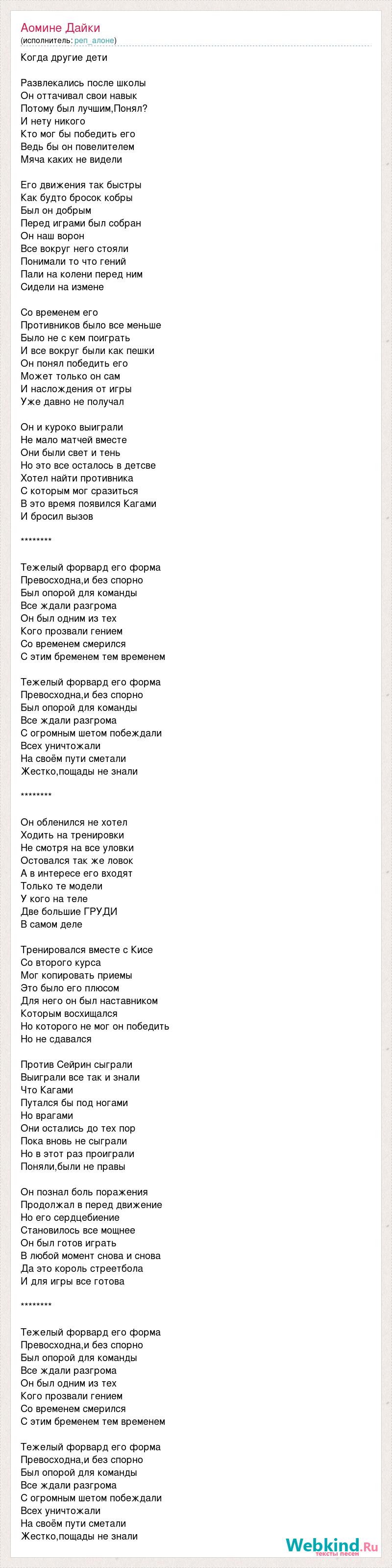 Когда другие дети Развлекались после школы Он оттачивал свои навык Потому был лучшим,Понял? И нету никого Кто мог бы победить его Ведь бы он повелителем Мяча каких не видели Его движения так быстры Как будто бросок кобры Был он добрым Перед играми был собран Он наш ворон Все вокруг него стояли Понимали то что гений Пали на колени перед ним Сидели на измене Со временем его Противников было все меньше Было не с кем поиграть И все вокруг были как пешки Он понял победить его Может только он сам И наслождения от игры Уже давно не получал Он и куроко выиграли Не мало матчей вместе Они были свет и тень Но это все осталось в детсве Хотел найти противника С которым мог сразиться В это время появился Кагами И бросил вызов ******** Тежелый форвард его форма Превосходна,и без спорно Был опорой для команды Все ждали разгрома Он был одним из тех Кого прозвали гением Со временем смерился С этим бременем тем временем Тежелый форвард его форма Превосходна,и без спорно Был опорой для команды Все ждали разгрома С огромным шетом побеждали Всех уничтожали На своём пути сметали Жестко,пощады не знали ******** Он обленился не хотел Ходить на тренировки Не смотря на все уловки Остовался так же ловок А в интересе его входят Только те модели У кого на теле Две большие ГРУДИ В самом деле Тренировался вместе с Кисе Со второго курса Мог копировать приемы Это было его плюсом Для него он был наставником Которым восхищался Но которого не мог он победить Но не сдавался Против Сейрин сыграли Выиграли все так и знали Что Кагами Путался бы под ногами Но врагами Они остались до тех пор Пока вновь не сыграли Но в этот раз проиграли Поняли,были не правы Он познал боль поражения Продолжал в перед движение Но его сердцебиение Становилось все мощнее Он был готов играть В любой момент снова и снова Да это король стреетбола И для игры все готова ******** Тежелый форвард его форма Превосходна,и без спорно Был опорой для команды Все ждали разгрома Он был одним из тех Кого прозвали гением Со временем смерился С этим бременем тем временем Тежелый форвард его форма Превосходна,и без спорно Был опорой для команды Все ждали разгрома С огромным шетом побеждали Всех уничтожали На своём пути сметали Жестко,пощады не знали