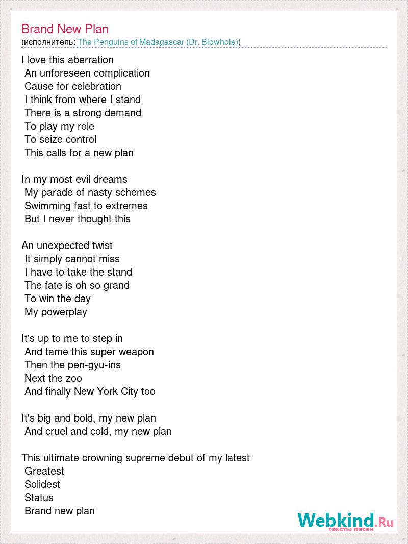 I love this aberration An unforeseen complication Cause for celebration I think from where I stand There is a strong demand To play my role To seize control This calls for a new plan In my most evil dreams My parade of nasty schemes Swimming fast to extremes But I never thought this An unexpected twist It simply cannot miss I have to take the stand The fate is oh so grand To win the day My powerplay It's up to me to step in And tame this super weapon Then the pen-gyu-ins Next the zoo And finally New York City too It's big and bold, my new plan And cruel and cold, my new plan This ultimate crowning supreme debut of my latest Greatest Solidest Status Brand new plan