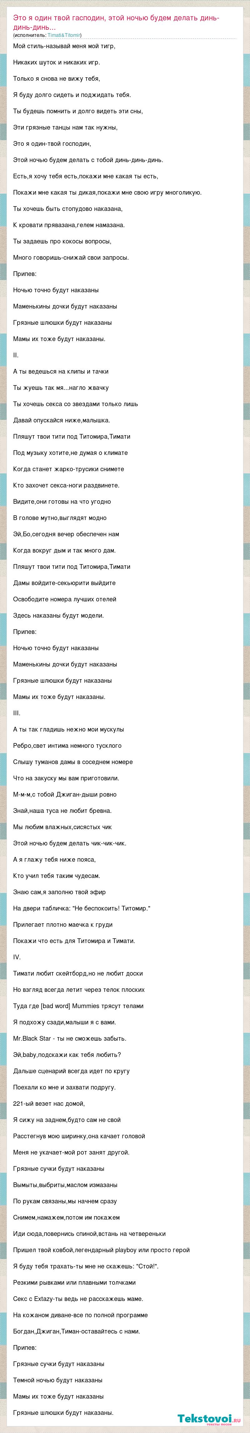 Мой стиль-называй меня мой тигр, Никаких шуток и никаких игр. Только я снова не вижу тебя, Я буду долго сидеть и поджидать тебя. Ты будешь помнить и долго видеть эти сны, Эти грязные танцы нам так нужны, Это я один-твой господин, Этой ночью будем делать с тобой динь-динь-динь. Есть,я хочу тебя есть,покажи мне какая ты есть, Покажи мне какая ты дикая,покажи мне свою игру многоликую. Ты хочешь быть стопудово наказана, К кровати прявазана,гелем намазана. Ты задаешь про кокосы вопросы, Много говоришь-снижай свои запросы. Припев: Ночью точно будут наказаны Маменькины дочки будут наказаны Грязные шлюшки будут наказаны Мамы их тоже будут наказаны. II. А ты ведешься на клипы и тачки Ты жуешь так мя...нагло жвачку Ты хочешь секса со звездами только лишь Давай опускайся ниже,малышка. Пляшут твои тити под Титомира,Тимати Под музыку хотите,не думая о климате Когда станет жарко-трусики снимете Кто захочет секса-ноги раздвинете. Видите,они готовы на что угодно В голове мутно,выглядят модно Эй,Бо,сегодня вечер обеспечен нам Когда вокруг дым и так много дам. Пляшут твои тити под Титомира,Тимати Дамы войдите-секьюрити выйдите Освободите номера лучших отелей Здесь наказаны будут модели. Припев: Ночью точно будут наказаны Маменькины дочки будут наказаны Грязные шлюшки будут наказаны Мамы их тоже будут наказаны. III. А ты так гладишь нежно мои мускулы Ребро,свет интима немного тусклого Слышу туманов дамы в соседнем номере Что на закуску мы вам приготовили. М-м-м,с тобой Джиган-дыши ровно Знай,наша туса не любит бревна. Мы любим влажных,сисястых чик Этой ночью будем делать чик-чик-чик. А я глажу тебя ниже пояса, Кто учил тебя таким чудесам. Знаю сам,я заполню твой эфир На двери табличка: "Не беспокоить! Титомир." Прилегает плотно маечка к груди Покажи что есть для Титомира и Тимати. IV. Тимати любит скейтборд,но не любит доски Но взгляд всегда летит через телок плоских Туда где [bad word] Mummies трясут телами Я подхожу сзади,малыши я с вами. Mr.Black Star - ты не сможешь забыть. Эй,baby,подскажи как тебя любить? Дальше сценарий всегда идет по кругу Поехали ко мне и захвати подругу. 221-ый везет нас домой, Я сижу на заднем,будто сам не свой Расстегнув мою ширинку,она качает головой Меня не укачает-мой рот занят другой. Грязные сучки будут наказаны Вымыты,выбриты,маслом измазаны По рукам связаны,мы начнем сразу Снимем,намажем,потом им покажем Иди сюда,повернись спиной,встань на четвереньки Пришел твой ковбой,легендарный playboy или просто герой Я буду тебя трахать-ты мне не скажешь: "Стой!". Резкими рывками или плавными толчками Секс с Extazy-ты ведь не расскажешь маме. На кожаном диване-все по полной программе Богдан,Джиган,Тиман-оставайтесь с нами. Припев: Грязные сучки будут наказаны Темной ночью будут наказаны Мамы их тоже будут наказаны Грязные шлюшки будут наказаны.