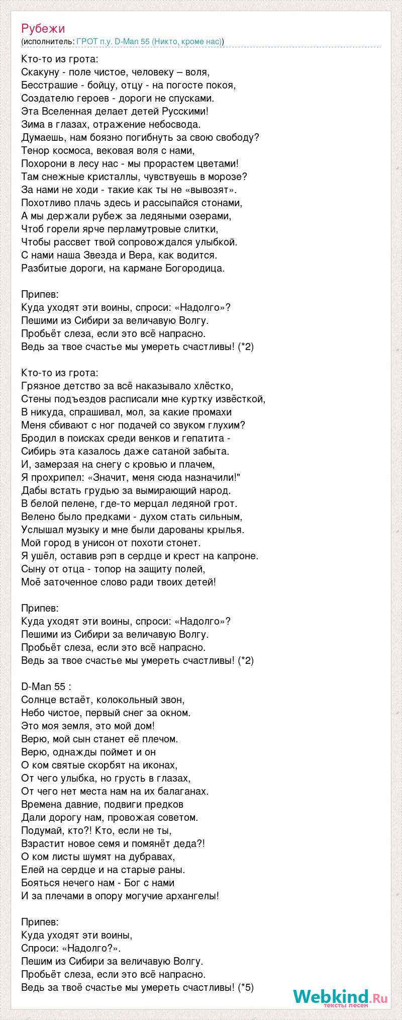 Кто-то из грота: Скакуну - поле чистое, человеку – воля, Бесстрашие - бойцу, отцу - на погосте покоя, Создателю героев - дороги не спусками. Эта Вселенная делает детей Русскими! Зима в глазах, отражение небосвода. Думаешь, нам боязно погибнуть за свою свободу? Тенор космоса, вековая воля с нами, Похорони в лесу нас - мы прорастем цветами! Там снежные кристаллы, чувствуешь в морозе? За нами не ходи - такие как ты не «вывозят». Похотливо плачь здесь и рассыпайся стонами, А мы держали рубеж за ледяными озерами, Чтоб горели ярче перламутровые слитки, Чтобы рассвет твой сопровождался улыбкой. С нами наша Звезда и Вера, как водится. Разбитые дороги, на кармане Богородица. Припев: Куда уходят эти воины, спроси: «Надолго»? Пешими из Сибири за величавую Волгу. Пробьёт слеза, если это всё напрасно. Ведь за твое счастье мы умереть счастливы! (*2) Кто-то из грота: Грязное детство за всё наказывало хлёстко, Стены подъездов расписали мне куртку извёсткой, В никуда, спрашивал, мол, за какие промахи Меня сбивают с ног подачей со звуком глухим? Бродил в поисках среди венков и гепатита - Сибирь эта казалось даже сатаной забыта. И, замерзая на снегу с кровью и плачем, Я прохрипел: «Значит, меня сюда назначили!" Дабы встать грудью за вымирающий народ. В белой пелене, где-то мерцал ледяной грот. Велено было предками - духом стать сильным, Услышал музыку и мне были дарованы крылья. Мой город в унисон от похоти стонет. Я ушёл, оставив рэп в сердце и крест на капроне. Сыну от отца - топор на защиту полей, Моё заточенное слово ради твоих детей! Припев: Куда уходят эти воины, спроси: «Надолго»? Пешими из Сибири за величавую Волгу. Пробьёт слеза, если это всё напрасно. Ведь за твое счастье мы умереть счастливы! (*2) D-Man 55 : Солнце встаёт, колокольный звон, Небо чистое, первый снег за окном. Это моя земля, это мой дом! Верю, мой сын станет её плечом. Верю, однажды поймет и он О ком святые скорбят на иконах, От чего улыбка, но грусть в глазах, От чего нет места нам на их балаганах. Времена давние, подвиги предков Дали дорогу нам, провожая советом. Подумай, кто?! Кто, если не ты, Взрастит новое семя и помянёт деда?! О ком листы шумят на дубравах, Елей на сердце и на старые раны. Бояться нечего нам - Бог с нами И за плечами в опору могучие архангелы! Припев: Куда уходят эти воины, Спроси: «Надолго?». Пешим из Сибири за величавую Волгу. Пробьёт слеза, если это всё напрасно. Ведь за твоё счастье мы умереть счастливы! (*5)