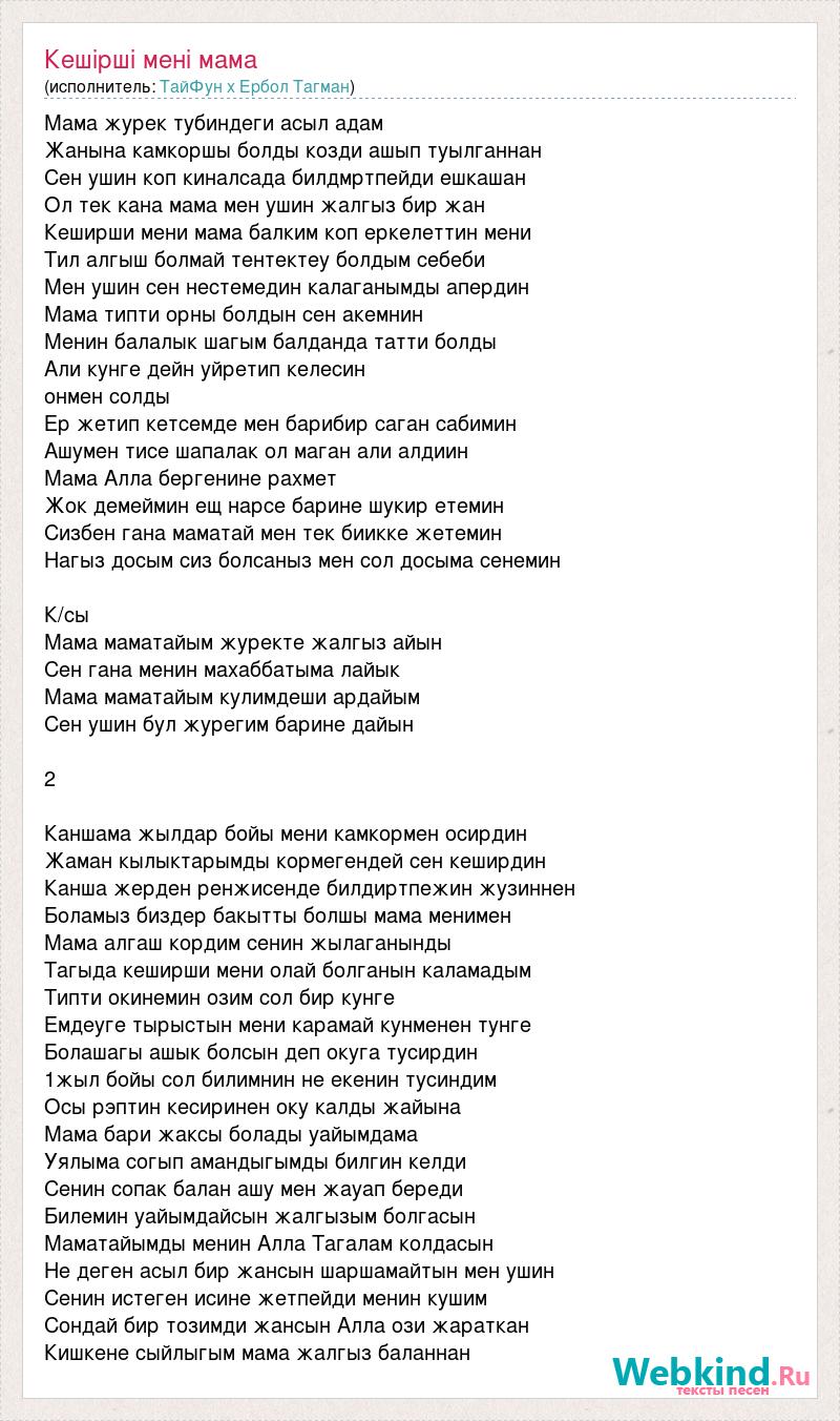 Мама журек тубиндеги асыл адам Жанына камкоршы болды козди ашып туылганнан Сен ушин коп киналсада билдмртпейди ешкашан Ол тек кана мама мен ушин жалгыз бир жан Кеширши мени мама балким коп еркелеттин мени Тил алгыш болмай тентектеу болдым себеби Мен ушин сен нестемедин калаганымды апердин Мама типти орны болдын сен акемнин Менин балалык шагым балданда татти болды Али кунге дейн уйретип келесин онмен солды Ер жетип кетсемде мен барибир саган сабимин Ашумен тисе шапалак ол маган али алдиин Мама Алла бергенине рахмет Жок демеймин ещ нарсе барине шукир етемин Сизбен гана маматай мен тек биикке жетемин Нагыз досым сиз болсаныз мен сол досыма сенемин К/сы Мама маматайым журекте жалгыз айын Сен гана менин махаббатыма лайык Мама маматайым кулимдеши ардайым Сен ушин бул журегим барине дайын 2 Каншама жылдар бойы мени камкормен осирдин Жаман кылыктарымды кормегендей сен кеширдин Канша жерден ренжисенде билдиртпежин жузиннен Боламыз биздер бакытты болшы мама менимен Мама алгаш кордим сенин жылаганынды Тагыда кеширши мени олай болганын каламадым Типти окинемин озим сол бир кунге Емдеуге тырыстын мени карамай кунменен тунге Болашагы ашык болсын деп окуга тусирдин 1жыл бойы сол билимнин не екенин тусиндим Осы рэптин кесиринен оку калды жайына Мама бари жаксы болады уайымдама Уялыма согып амандыгымды билгин келди Сенин сопак балан ашу мен жауап береди Билемин уайымдайсын жалгызым болгасын Маматайымды менин Алла Тагалам колдасын Не деген асыл бир жансын шаршамайтын мен ушин Сенин истеген исине жетпейди менин кушим Сондай бир тозимди жансын Алла ози жараткан Кишкене сыйлыгым мама жалгыз баланнан