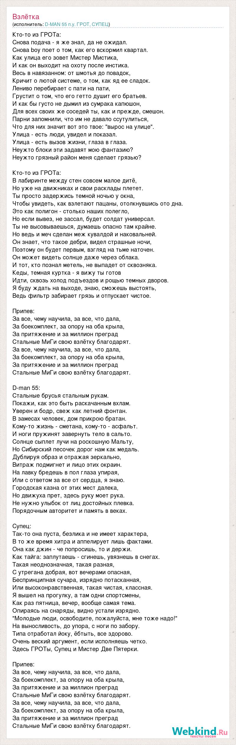 Кто-то из ГРОТа: Снова подача - я же знал, да не ожидал. Снова boy поет о том, как его вскормил квартал. Как улица его зовет Мистер Мистика, И как он выходит на охоту после инстика. Весь в навязанном: от шмотья до повадок, Кричит о лютой системе, о том, как яд ее сладок. Лениво перебирает с пати на пати, Грустит о том, что его гетто душит его братьев. И как бы густо не дымил из сумрака капюшон, Для всех своих же соседей ты, как и прежде, смешон. Парни запомнили, что им не давало ссутулиться, Что для них значит вот это твое: "вырос на улице". Улица - есть люди, увидел и показал. Улица - есть вызов жизни, глаза в глаза. Неужто блоки эти задавят мою фантазию? Неужто грязный район меня сделает грязью? Кто-то из ГРОТа: В лабиринте между стен совсем малое дитё, Но уже на движниках и свои расклады плетет. Ты просто задержись темной ночью у окна, Чтобы увидеть, как взлетают пацаны, отолкнувшись ото дна. Это как полигон - столько наших полегло, Но если вывез, не зассал, будет солдат универсал. Ты не высовываешься, думаешь опасно там крайне. Но ведь и меч сделан меж кувалдой и наковальней. Он знает, что такое дебри, видел страшные ночи, Поэтому он будет первым, взгляд на тьме наточен. Он может видеть солнце даже через облака. И тот, кто познал метель, не выпадет от сквозняка. Кеды, темная куртка - я вижу ты готов Идти, сквозь холод подъездов и рощью темных дворов. Я буду ждать на выходе, знаю, сможешь выстоять, Ведь фильтр забирает грязь и отпускает чистое. Припев: За все, чему научила, за все, что дала, За боекомплект, за опору на оба крыла, За притяжение и за миллион преград Стальные МиГи свою взлётку благодарят. За все, чему научила, за все, что дала, За боекомплект, за опору на оба крыла, За притяжение и за миллион преград Стальные МиГи свою взлётку благодарят. D-man 55: Стальные брусья стальным рукам. Покажи, как это быть раскачанным вхлам. Уверен и бодр, свеж как летний фонтан. В замесах человек, дом прикрою братан. Кому-то жизнь - сметана, кому-то - асфальт. И ноги пружинят завернуть тело в сальто. Солнце сыплет лучи на роскошную Мальту, Но Сибирский песочек дорог нам как медаль. Дублируя образ и отражая зеркально, Витраж подмигнет и лицо этих окраин. На лавку бредешь в пол глаза упирая, Или с ответом за все от сердца, я знаю. Городская казна от этих мест далека, Но движуха прет, здесь руку моет рука. Не нужно улыбок от лиц достойных плевка. Порядочным авторитет и память в веках. Супец: Так-то она пуста, безлика и не имеет характера, В то же время хитра и аппелирует лишь фактами. Она как джин - че попросишь, то и держи. Как тайга: заплутаешь - сгинешь, увязнешь в снегах. Такая неоднозначная, такая разная, С утрегана добрая, вот вечерами опасная, Беспринципная сучара, изрядно потасканная, Или высоконравственная, такая чистая, классная. Я вышел на прогулку, а там одни спортсмены, Как раз пятница, вечер, вообще самая тема. Опираясь на снаряды, видно устали изрядно. "Молодые люди, освободите, пожалуйста, мне тоже надо!" На выносливость, до упора, с ноги по забору. Типа отработал йоку, ёбтыть, все здорово. Очень веский аргумент, если исполняешь четко. Здесь ГРОТы, Супец и Мистер Две Пятерки. Припев: За все, чему научила, за все, что дала, За боекомплект, за опору на оба крыла, За притяжение и за миллион преград Стальные МиГи свою взлётку благодарят. За все, чему научила, за все, что дала, За боекомплект, за опору на 