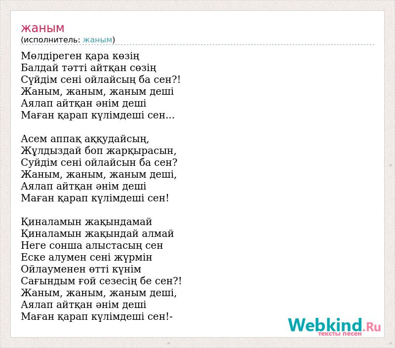 Мөлдіреген қара көзің Балдай тәтті айтқан сөзің Сүйдім сені ойлайсың ба сен?! Жаным, жаным, жаным деші Аялап айтқан әнім деші Маған қарап күлімдеші сен... Асем аппақ аққудайсың, Жұлдыздай боп жарқырасын, Суйдiм сенi ойлайсын ба сен? Жаным, жаным, жаным деші, Аялап айтқан әнім деші Маған қарап күлімдеші сен! Қиналамын жақындамай Қиналамын жақындай алмай Неге сонша алыстасың сен Еске алумен сені жүрмін Ойлауменен өтті күнім Сағындым ғой сезесің бе сен?! Жаным, жаным, жаным деші, Аялап айтқан әнім деші Маған қарап күлімдеші сен!-