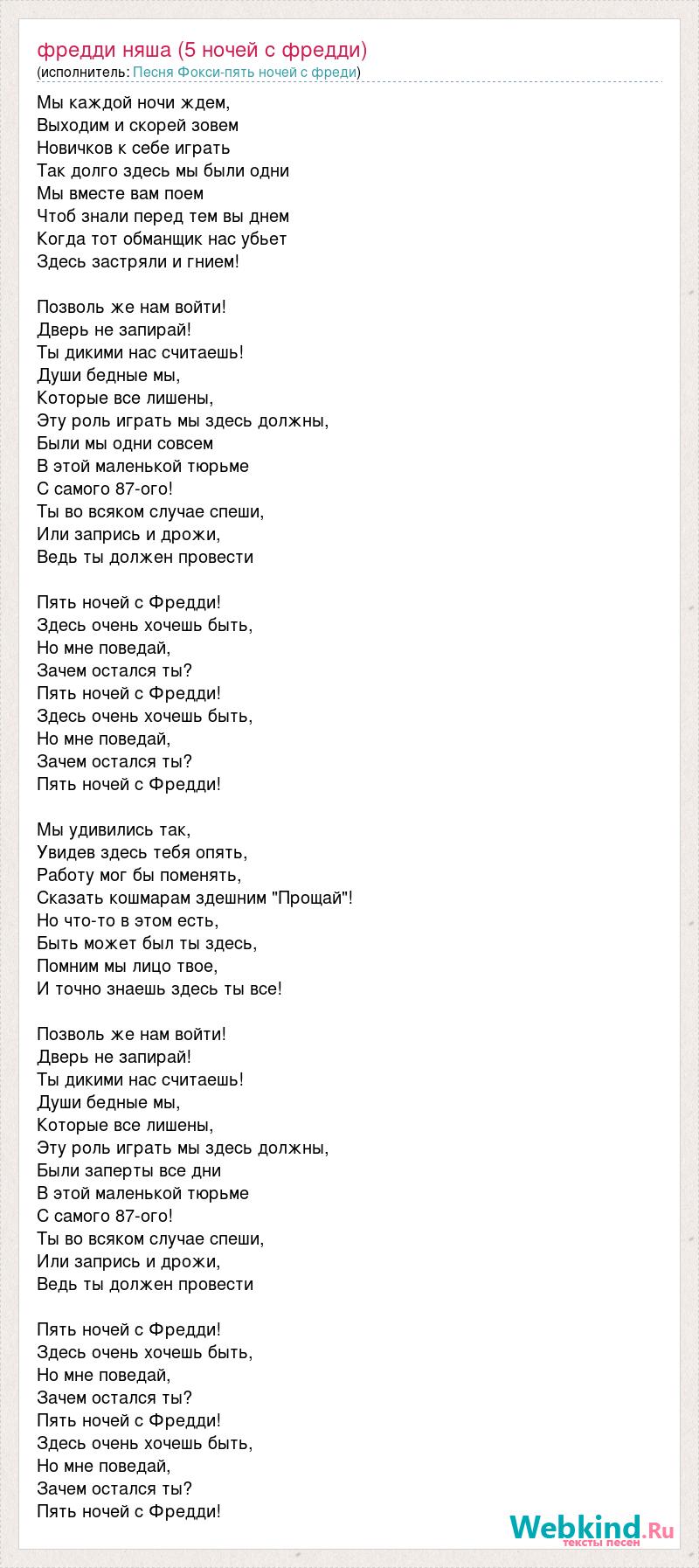 Мы каждой ночи ждем, Выходим и скорей зовем Новичков к себе играть Так долго здесь мы были одни Мы вместе вам поем Чтоб знали перед тем вы днем Когда тот обманщик нас убьет Здесь застряли и гнием! Позволь же нам войти! Дверь не запирай! Ты дикими нас считаешь! Души бедные мы, Которые все лишены, Эту роль играть мы здесь должны, Были мы одни совсем В этой маленькой тюрьме С самого 87-ого! Ты во всяком случае спеши, Или запрись и дрожи, Ведь ты должен провести Пять ночей с Фредди! Здесь очень хочешь быть, Но мне поведай, Зачем остался ты? Пять ночей с Фредди! Здесь очень хочешь быть, Но мне поведай, Зачем остался ты? Пять ночей с Фредди! Мы удивились так, Увидев здесь тебя опять, Работу мог бы поменять, Сказать кошмарам здешним "Прощай"! Но что-то в этом есть, Быть может был ты здесь, Помним мы лицо твое, И точно знаешь здесь ты все! Позволь же нам войти! Дверь не запирай! Ты дикими нас считаешь! Души бедные мы, Которые все лишены, Эту роль играть мы здесь должны, Были заперты все дни В этой маленькой тюрьме С самого 87-ого! Ты во всяком случае спеши, Или запрись и дрожи, Ведь ты должен провести Пять ночей с Фредди! Здесь очень хочешь быть, Но мне поведай, Зачем остался ты? Пять ночей с Фредди! Здесь очень хочешь быть, Но мне поведай, Зачем остался ты? Пять ночей с Фредди!