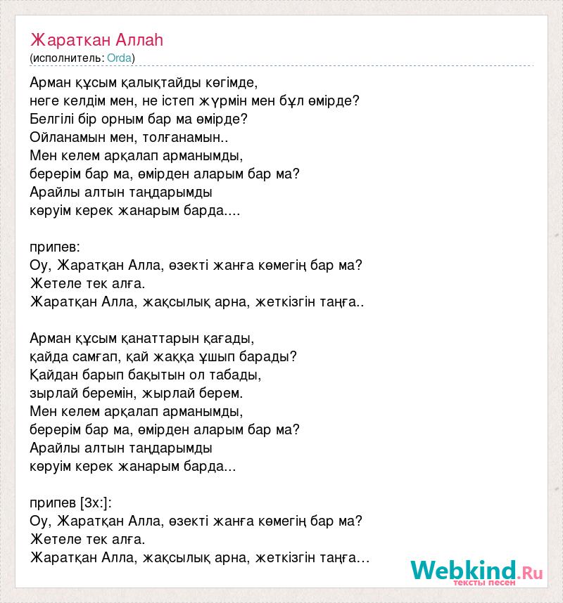 Арман құсым қалықтайды көгімде, неге келдім мен, не істеп жүрмін мен бұл өмірде? Белгілі бір орным бар ма өмірде? Ойланамын мен, толғанамын.. Мен келем арқалап арманымды, берерім бар ма, өмірден аларым бар ма? Арайлы алтын таңдарымды көруім керек жанарым барда.... припев: Оу, Жаратқан Алла, өзекті жанға көмегің бар ма? Жетеле тек алға. Жаратқан Алла, жақсылық арна, жеткізгін таңға.. Арман құсым қанаттарын қағады, қайда самғап, қай жаққа ұшып барады? Қайдан барып бақытын ол табады, зырлай беремін, жырлай берем. Мен келем арқалап арманымды, берерім бар ма, өмірден аларым бар ма? Арайлы алтын таңдарымды көруім керек жанарым барда... припев [3x:]: Оу, Жаратқан Алла, өзекті жанға көмегің бар ма? Жетеле тек алға. Жаратқан Алла, жақсылық арна, жеткізгін таңға…