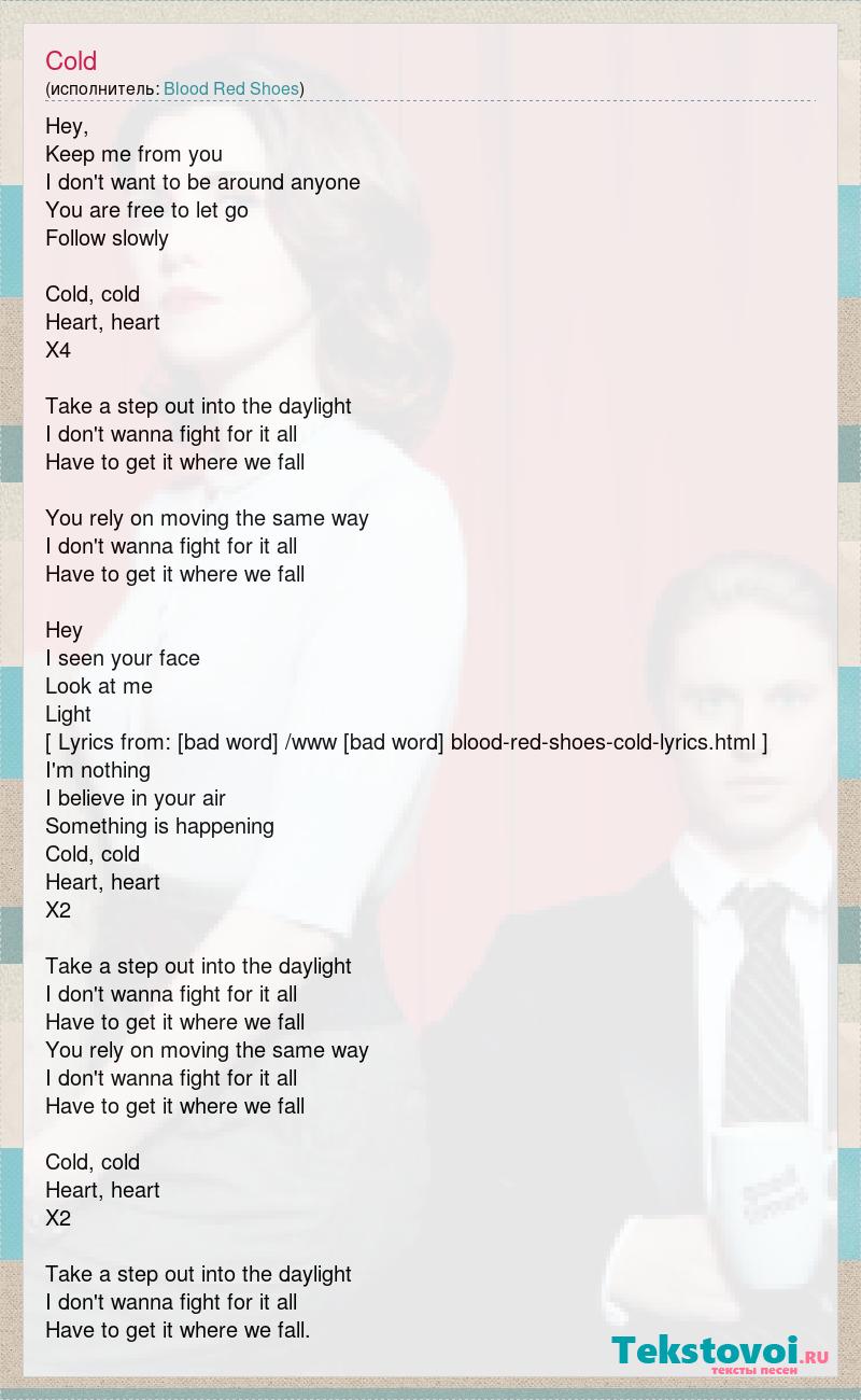 Hey, Keep me from you I don't want to be around anyone You are free to let go Follow slowly Cold, cold Heart, heart X4 Take a step out into the daylight I don't wanna fight for it all Have to get it where we fall You rely on moving the same way I don't wanna fight for it all Have to get it where we fall Hey I seen your face Look at me Light [ Lyrics from: [bad word] /www [bad word] blood-red-shoes-cold-lyrics.html ] I'm nothing I believe in your air Something is happening Cold, cold Heart, heart X2 Take a step out into the daylight I don't wanna fight for it all Have to get it where we fall You rely on moving the same way I don't wanna fight for it all Have to get it where we fall Cold, cold Heart, heart X2 Take a step out into the daylight I don't wanna fight for it all Have to get it where we fall.