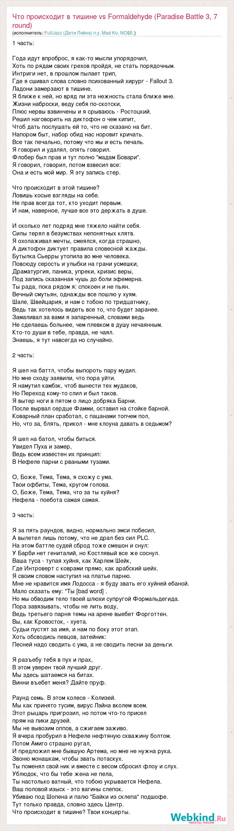 А как ты думаешь, о чем песня "Что происходит в тишине vs Formaldehyde (Paradise Battle 3, 7 round)" ?