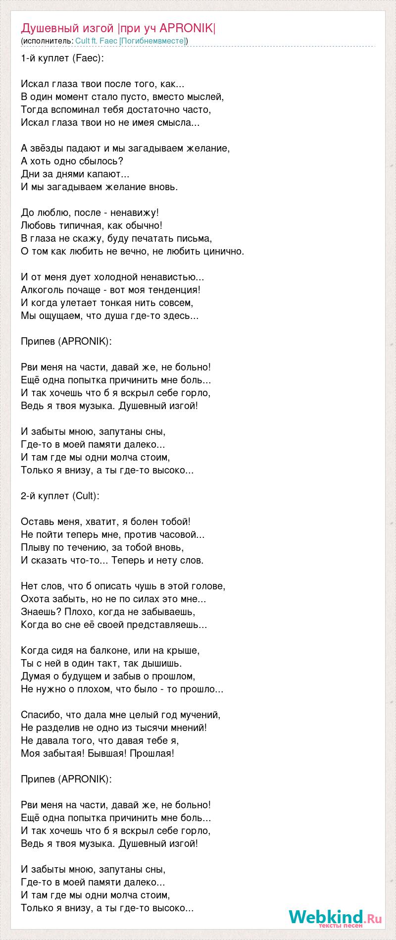 1-й куплет (Faec): Искал глаза твои после того, как... В один момент стало пусто, вместо мыслей, Тогда вспоминал тебя достаточно часто, Искал глаза твои но не имея смысла... А звёзды падают и мы загадываем желание, А хоть одно сбылось? Дни за днями капают... И мы загадываем желание вновь. До люблю, после - ненавижу! Любовь типичная, как обычно! В глаза не скажу, буду печатать письма, О том как любить не вечно, не любить цинично. И от меня дует холодной ненавистью... Алкоголь почаще - вот моя тенденция! И когда улетает тонкая нить совсем, Мы ощущаем, что душа где-то здесь... Припев (APRONIK): Рви меня на части, давай же, не больно! Ещё одна попытка причинить мне боль... И так хочешь что б я вскрыл себе горло, Ведь я твоя музыка. Душевный изгой! И забыты мною, запутаны сны, Где-то в моей памяти далеко... И там где мы одни молча стоим, Только я внизу, а ты где-то высоко... 2-й куплет (Cult): Оставь меня, хватит, я болен тобой! Не пойти теперь мне, против часовой... Плыву по течению, за тобой вновь, И сказать что-то... Теперь и нету слов. Нет слов, что б описать чушь в этой голове, Охота забыть, но не по силах это мне... Знаешь? Плохо, когда не забываешь, Когда во сне её своей представляешь... Когда сидя на балконе, или на крыше, Ты с ней в один такт, так дышишь. Думая о будущем и забыв о прошлом, Не нужно о плохом, что было - то прошло... Спасибо, что дала мне целый год мучений, Не разделив не одно из тысячи мнений! Не давала того, что давая тебе я, Моя забытая! Бывшая! Прошлая! Припев (APRONIK): Рви меня на части, давай же, не больно! Ещё одна попытка причинить мне боль... И так хочешь что б я вскрыл себе горло, Ведь я твоя музыка. Душевный изгой! И забыты мною, запутаны сны, Где-то в моей памяти далеко... И там где мы одни молча стоим, Только я внизу, а ты где-то высоко...