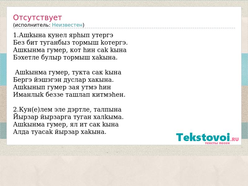 1.Ашkына кyнел ярhып утергэ Без бит туганбыз тормыш kотергэ. Ашкынма гyмер, кот hин cаk kына Бэхетле булыр тормыш хаkына. Ашkынма гyмер, тукта cак kына Бергэ йэшэгэн дуслар хакына. Ашkынып гyмер зая утмэ hин Иманлыk беззе ташлап китмэhен. 2.Кун(е)лем эле дэртле, талпына Йырзар йырзарга туган халkыма. Ашkынма гyмер, ял ит cак kына Алда туаcаk йырзар хаkына.