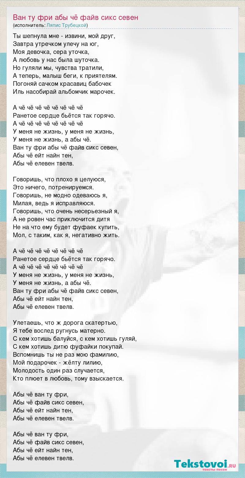 Ты шепнула мне - извини, мой друг, Завтра утречком улечу на юг, Моя девочка, сера уточка, А любовь у нас была шуточка. Но гуляли мы, чувства тратили, А теперь, малыш беги, к приятелям. Погоняй сачком красавиц бабочек Иль насобирай альбомчик марочек. А чё чё чё чё чё чё чё чё Ранетое сердце бьётся так горячо. А чё чё чё чё чё чё чё чё У меня не жизнь, у меня не жизнь, У меня не жизнь, а абы чё. Ван ту фри абы чё файв сикс севен, Абы чё ейт найн тен, Абы чё елевен твелв. Говоришь, что плохо я целуюся, Это ничего, потренируемся. Говоришь, не модно одеваюсь я, Милая, ведь я исправляюся. Говоришь, что очень несерьезный я, А не ровен час приключится дитя Не на что ему будет фуфаек купить, Мол, с таким, как я, негативно жить. А чё чё чё чё чё чё чё чё Ранетое сердце бьётся так горячо. А чё чё чё чё чё чё чё чё У меня не жизнь, у меня не жизнь, У меня не жизнь, а абы чё. Ван ту фри абы чё файв сикс севен, Абы чё ейт найн тен, Абы чё елевен твелв. Улетаешь, что ж дорога скатертью, Я тебе вослед ругнусь матерно. С кем хотишь балуйся, с кем хотишь гуляй, С кем хотишь дитю фуфайки покупай. Вспомнишь ты не раз мою фамилию, Мой подарочек - жёлту лилию, Молодость один раз случается, Кто плюет в любовь, тому взыскается. Абы чё ван ту фри, Абы чё файв сикс севен, Абы чё ейт найн тен, Абы чё елевен твелв. Абы чё ван ту фри, Абы чё файв сикс севен, Абы чё ейт найн тен, Абы чё елевен твелв.