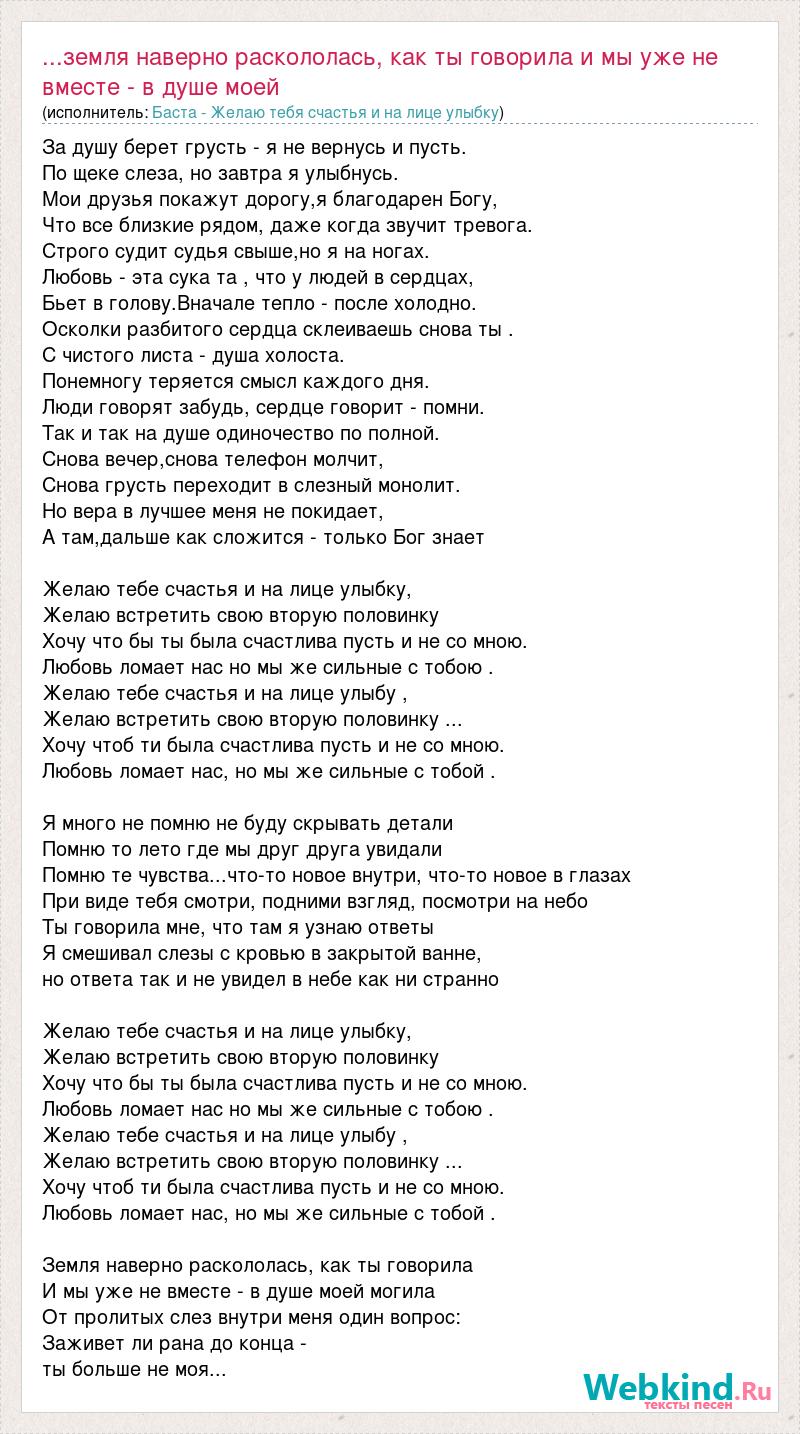 За душу берет грусть - я не вернусь и пусть. По щеке слеза, но завтра я улыбнусь. Мои друзья покажут дорогу,я благодарен Богу, Что все близкие рядом, даже когда звучит тревога. Строго судит судья свыше,но я на ногах. Любовь - эта сука та , что у людей в сердцах, Бьет в голову.Вначале тепло - после холодно. Осколки разбитого сердца склеиваешь снова ты . С чистого листа - душа холоста. Понемногу теряется смысл каждого дня. Люди говорят забудь, сердце говорит - помни. Так и так на душе одиночество по полной. Снова вечер,снова телефон молчит, Снова грусть переходит в слезный монолит. Но вера в лучшее меня не покидает, А там,дальше как сложится - только Бог знает Желаю тебе счастья и на лице улыбку, Желаю встретить свою вторую половинку Хочу что бы ты была счастлива пусть и не со мною. Любовь ломает нас но мы же сильные с тобою . Желаю тебе счастья и на лице улыбу , Желаю встретить свою вторую половинку ... Хочу чтоб ти была счастлива пусть и не со мною. Любовь ломает нас, но мы же сильные с тобой . Я много не помню не буду скрывать детали Помню то лето где мы друг друга увидали Помню те чувства...что-то новое внутри, что-то новое в глазах При виде тебя смотри, подними взгляд, посмотри на небо Ты говорила мне, что там я узнаю ответы Я смешивал слезы с кровью в закрытой ванне, но ответа так и не увидел в небе как ни странно Желаю тебе счастья и на лице улыбку, Желаю встретить свою вторую половинку Хочу что бы ты была счастлива пусть и не со мною. Любовь ломает нас но мы же сильные с тобою . Желаю тебе счастья и на лице улыбу , Желаю встретить свою вторую половинку ... Хочу чтоб ти была счастлива пусть и не со мною. Любовь ломает нас, но мы же сильные с тобой . Земля наверно раскололась, как ты говорила И мы уже не вместе - в душе моей могила От пролитых слез внутри меня один вопрос: Заживет ли рана до конца - ты больше не моя...
