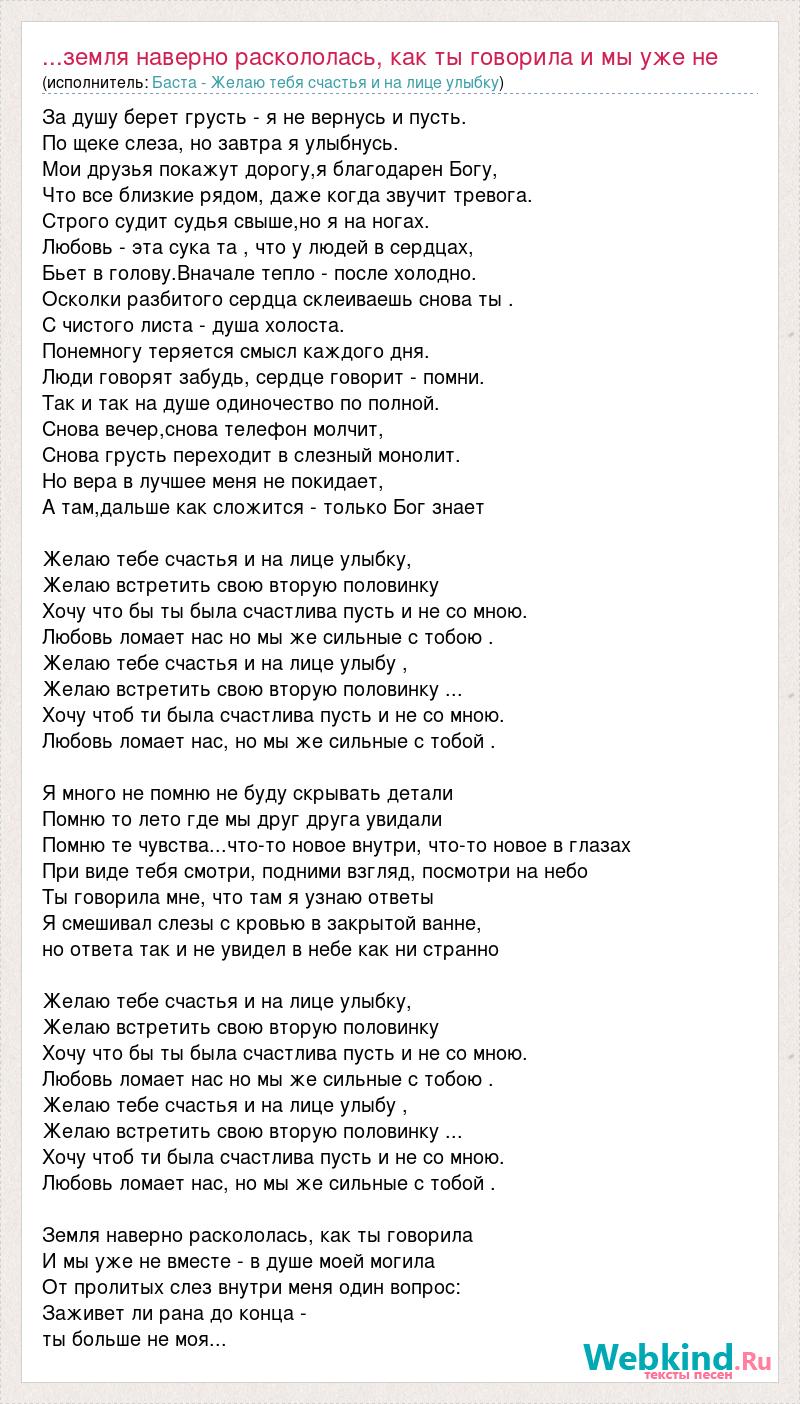 За душу берет грусть - я не вернусь и пусть. По щеке слеза, но завтра я улыбнусь. Мои друзья покажут дорогу,я благодарен Богу, Что все близкие рядом, даже когда звучит тревога. Строго судит судья свыше,но я на ногах. Любовь - эта сука та , что у людей в сердцах, Бьет в голову.Вначале тепло - после холодно. Осколки разбитого сердца склеиваешь снова ты . С чистого листа - душа холоста. Понемногу теряется смысл каждого дня. Люди говорят забудь, сердце говорит - помни. Так и так на душе одиночество по полной. Снова вечер,снова телефон молчит, Снова грусть переходит в слезный монолит. Но вера в лучшее меня не покидает, А там,дальше как сложится - только Бог знает Желаю тебе счастья и на лице улыбку, Желаю встретить свою вторую половинку Хочу что бы ты была счастлива пусть и не со мною. Любовь ломает нас но мы же сильные с тобою . Желаю тебе счастья и на лице улыбу , Желаю встретить свою вторую половинку ... Хочу чтоб ти была счастлива пусть и не со мною. Любовь ломает нас, но мы же сильные с тобой . Я много не помню не буду скрывать детали Помню то лето где мы друг друга увидали Помню те чувства...что-то новое внутри, что-то новое в глазах При виде тебя смотри, подними взгляд, посмотри на небо Ты говорила мне, что там я узнаю ответы Я смешивал слезы с кровью в закрытой ванне, но ответа так и не увидел в небе как ни странно Желаю тебе счастья и на лице улыбку, Желаю встретить свою вторую половинку Хочу что бы ты была счастлива пусть и не со мною. Любовь ломает нас но мы же сильные с тобою . Желаю тебе счастья и на лице улыбу , Желаю встретить свою вторую половинку ... Хочу чтоб ти была счастлива пусть и не со мною. Любовь ломает нас, но мы же сильные с тобой . Земля наверно раскололась, как ты говорила И мы уже не вместе - в душе моей могила От пролитых слез внутри меня один вопрос: Заживет ли рана до конца - ты больше не моя...