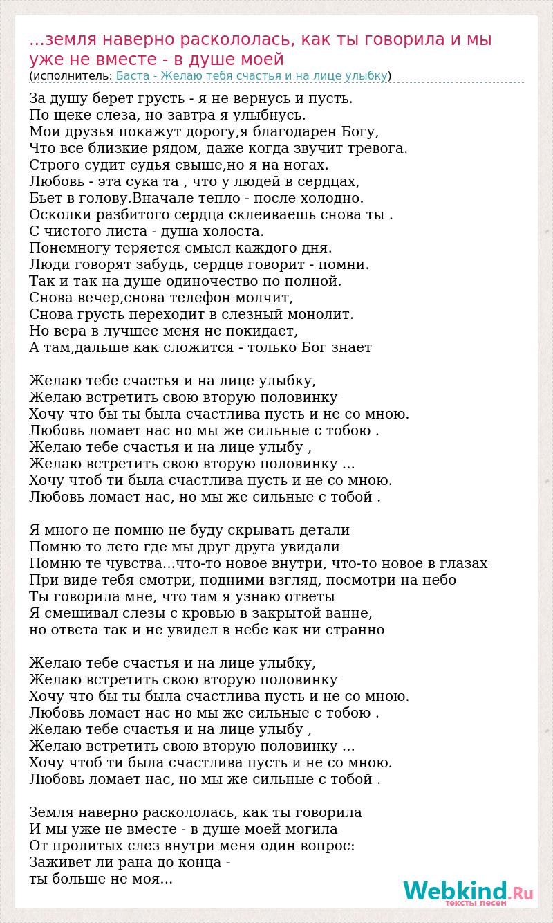 За душу берет грусть - я не вернусь и пусть. По щеке слеза, но завтра я улыбнусь. Мои друзья покажут дорогу,я благодарен Богу, Что все близкие рядом, даже когда звучит тревога. Строго судит судья свыше,но я на ногах. Любовь - эта сука та , что у людей в сердцах, Бьет в голову.Вначале тепло - после холодно. Осколки разбитого сердца склеиваешь снова ты . С чистого листа - душа холоста. Понемногу теряется смысл каждого дня. Люди говорят забудь, сердце говорит - помни. Так и так на душе одиночество по полной. Снова вечер,снова телефон молчит, Снова грусть переходит в слезный монолит. Но вера в лучшее меня не покидает, А там,дальше как сложится - только Бог знает Желаю тебе счастья и на лице улыбку, Желаю встретить свою вторую половинку Хочу что бы ты была счастлива пусть и не со мною. Любовь ломает нас но мы же сильные с тобою . Желаю тебе счастья и на лице улыбу , Желаю встретить свою вторую половинку ... Хочу чтоб ти была счастлива пусть и не со мною. Любовь ломает нас, но мы же сильные с тобой . Я много не помню не буду скрывать детали Помню то лето где мы друг друга увидали Помню те чувства...что-то новое внутри, что-то новое в глазах При виде тебя смотри, подними взгляд, посмотри на небо Ты говорила мне, что там я узнаю ответы Я смешивал слезы с кровью в закрытой ванне, но ответа так и не увидел в небе как ни странно Желаю тебе счастья и на лице улыбку, Желаю встретить свою вторую половинку Хочу что бы ты была счастлива пусть и не со мною. Любовь ломает нас но мы же сильные с тобою . Желаю тебе счастья и на лице улыбу , Желаю встретить свою вторую половинку ... Хочу чтоб ти была счастлива пусть и не со мною. Любовь ломает нас, но мы же сильные с тобой . Земля наверно раскололась, как ты говорила И мы уже не вместе - в душе моей могила От пролитых слез внутри меня один вопрос: Заживет ли рана до конца - ты больше не моя...