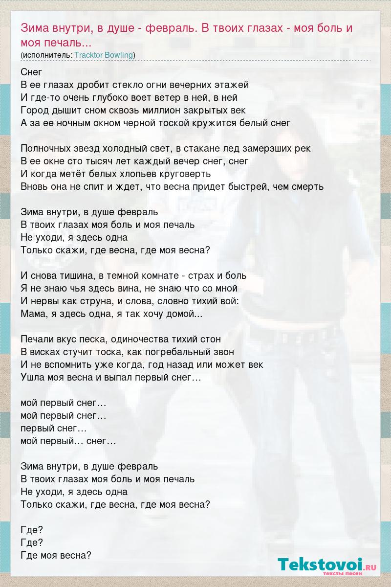 Главная→Исполнители→Tracktor Bowling→Зима внутри, в душе - февраль. В твоих глазах - моя боль и моя печаль...