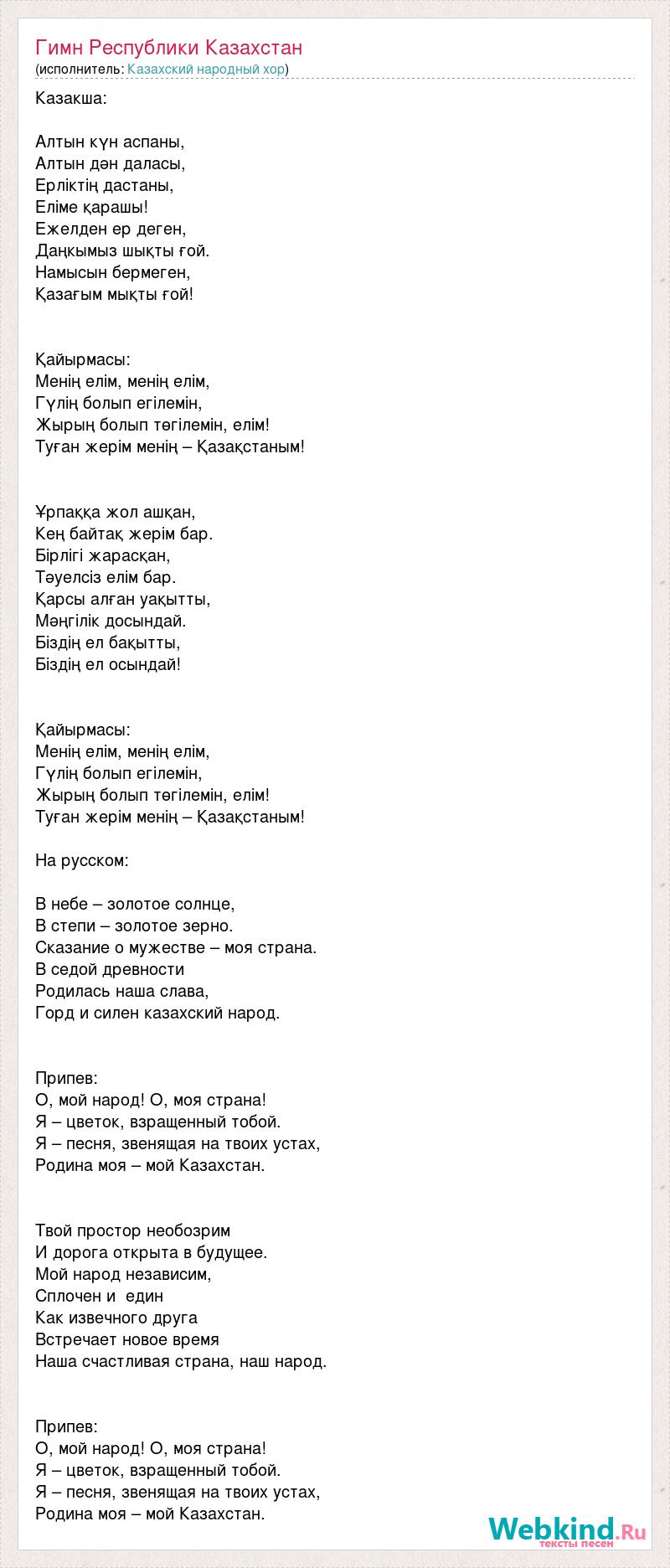 Казакша: Алтын күн аспаны, Алтын дән даласы, Ерліктің дастаны, Еліме қарашы! Ежелден ер деген, Даңкымыз шықты ғой. Намысын бермеген, Қазағым мықты ғой! Қайырмасы: Менің елім, менің елім, Гүлің болып егілемін, Жырың болып төгілемін, елім! Туған жерім менің – Қазақстаным! Ұрпаққа жол ашқан, Кең байтақ жерім бар. Бірлігі жарасқан, Тәуелсіз елім бар. Қарсы алған уақытты, Мәңгілік досындай. Біздің ел бақытты, Біздің ел осындай! Қайырмасы: Менің елім, менің елім, Гүлің болып егілемін, Жырың болып төгілемін, елім! Туған жерім менің – Қазақстаным! На русском: В небе – золотое солнце, В степи – золотое зерно. Сказание о мужестве – моя страна. В седой древности Родилась наша слава, Горд и силен казахский народ. Припев: О, мой народ! О, моя страна! Я – цветок, взращенный тобой. Я – песня, звенящая на твоих устах, Родина моя – мой Казахстан. Твой простор необозрим И дорога открыта в будущее. Мой народ независим, Сплочен и един Как извечного друга Встречает новое время Наша счастливая страна, наш народ. Припев: О, мой народ! О, моя страна! Я – цветок, взращенный тобой. Я – песня, звенящая на твоих устах, Родина моя – мой Казахстан.