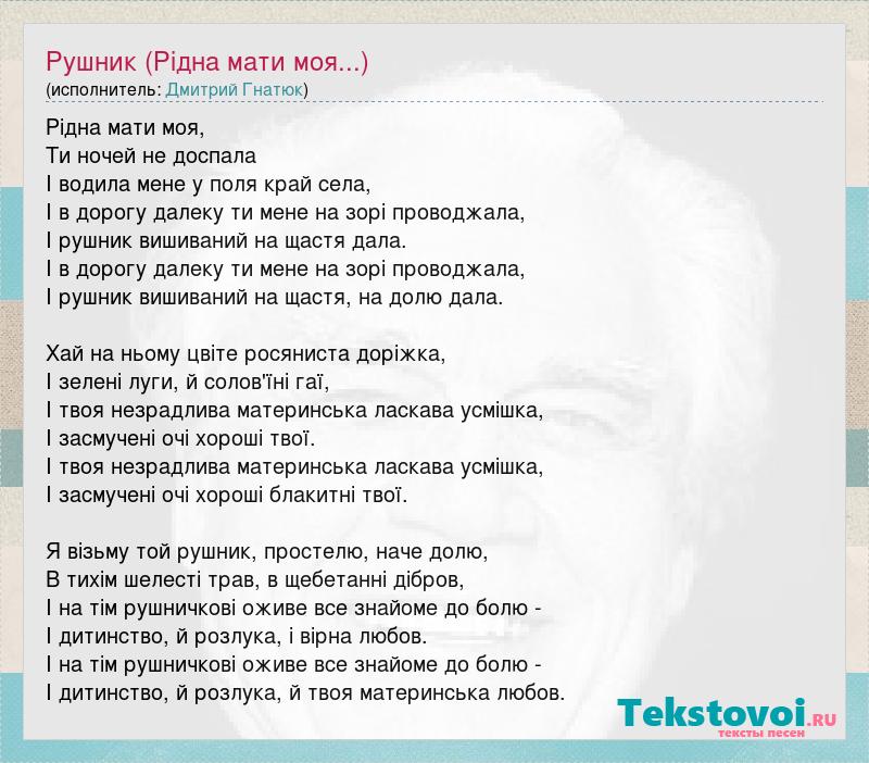 Рідна мати моя, Ти ночей не доспала I водила мене у поля край села, І в дорогу далеку ти мене на зорі проводжала, І рушник вишиваний на щастя дала. І в дорогу далеку ти мене на зорі проводжала, І рушник вишиваний на щастя, на долю дала. Хай на ньому цвіте росяниста доріжка, І зелені луги, й солов'їні гаї, І твоя незрадлива материнська ласкава усмішка, І засмучені очі хороші твої. І твоя незрадлива материнська ласкава усмішка, І засмучені очі хороші блакитні твої. Я візьму той рушник, простелю, наче долю, В тихім шелесті трав, в щебетанні дібров, І на тім рушничкові оживе все знайоме до болю - І дитинство, й розлука, і вірна любов. І на тім рушничкові оживе все знайоме до болю - І дитинство, й розлука, й твоя материнська любов.