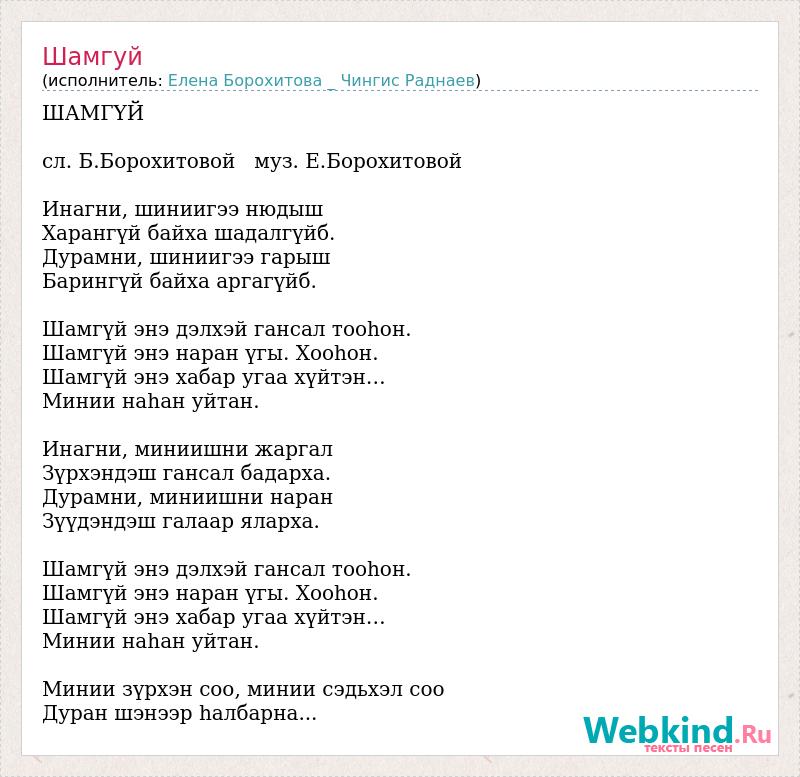 ШАМГҮЙ сл. Б.Борохитовой муз. Е.Борохитовой Инагни, шиниигээ нюдыш Харангүй байха шадалгүйб. Дурамни, шиниигээ гарыш Барингүй байха аргагүйб. Шамгүй энэ дэлхэй гансал тооhон. Шамгүй энэ наран үгы. Хооhон. Шамгүй энэ хабар угаа хүйтэн… Минии наhан уйтан. Инагни, миниишни жаргал Зүрхэндэш гансал бадарха. Дурамни, миниишни наран Зүүдэндэш галаар яларха. Шамгүй энэ дэлхэй гансал тооhон. Шамгүй энэ наран үгы. Хооhон. Шамгүй энэ хабар угаа хүйтэн… Минии наhан уйтан. Минии зүрхэн соо, минии сэдьхэл соо Дуран шэнээр hалбарна...