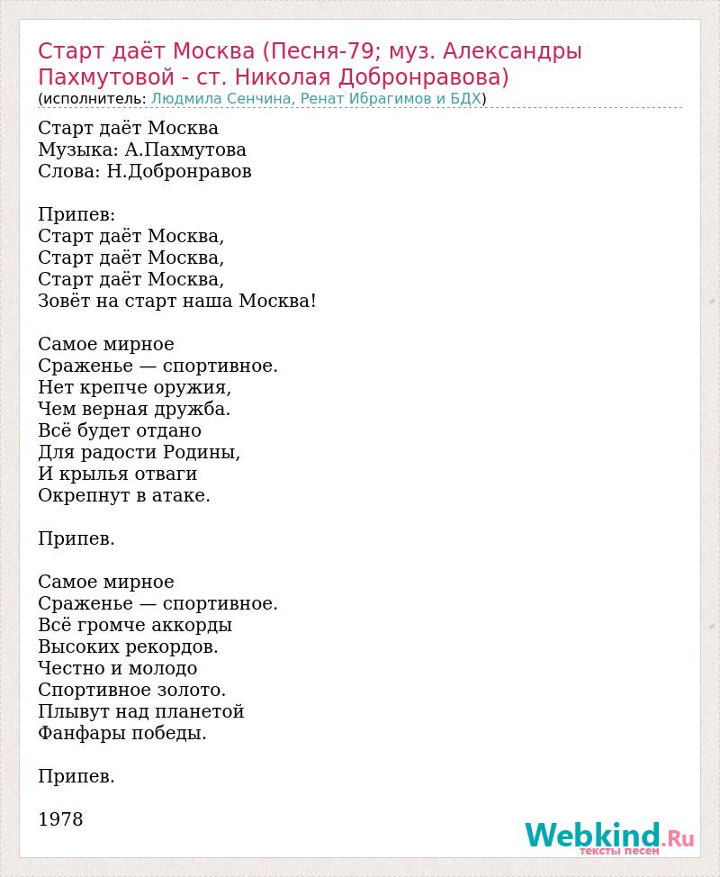 Старт даёт Москва Музыка: А.Пахмутова Слова: Н.Добронравов Припев: Старт даёт Москва, Старт даёт Москва, Старт даёт Москва, Зовёт на старт наша Москва! Самое мирное Сраженье — спортивное. Нет крепче оружия, Чем верная дружба. Всё будет отдано Для радости Родины, И крылья отваги Окрепнут в атаке. Припев. Самое мирное Сраженье — спортивное. Всё громче аккорды Высоких рекордов. Честно и молодо Спортивное золото. Плывут над планетой Фанфары победы. Припев. 1978