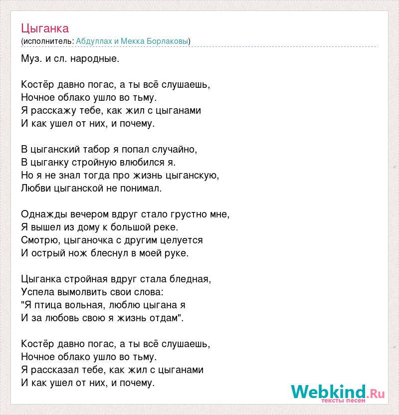 Муз. и сл. народные. Костёр давно погас, а ты всё слушаешь, Ночное облако ушло во тьму. Я расскажу тебе, как жил с цыганами И как ушел от них, и почему. В цыганский табор я попал случайно, В цыганку стройную влюбился я. Но я не знал тогда про жизнь цыганскую, Любви цыганской не понимал. Однажды вечером вдруг стало грустно мне, Я вышел из дому к большой реке. Смотрю, цыганочка с другим целуется И острый нож блеснул в моей руке. Цыганка стройная вдруг стала бледная, Успела вымолвить свои слова: "Я птица вольная, люблю цыгана я И за любовь свою я жизнь отдам". Костёр давно погас, а ты всё слушаешь, Ночное облако ушло во тьму. Я рассказал тебе, как жил с цыганами И как ушел от них, и почему.