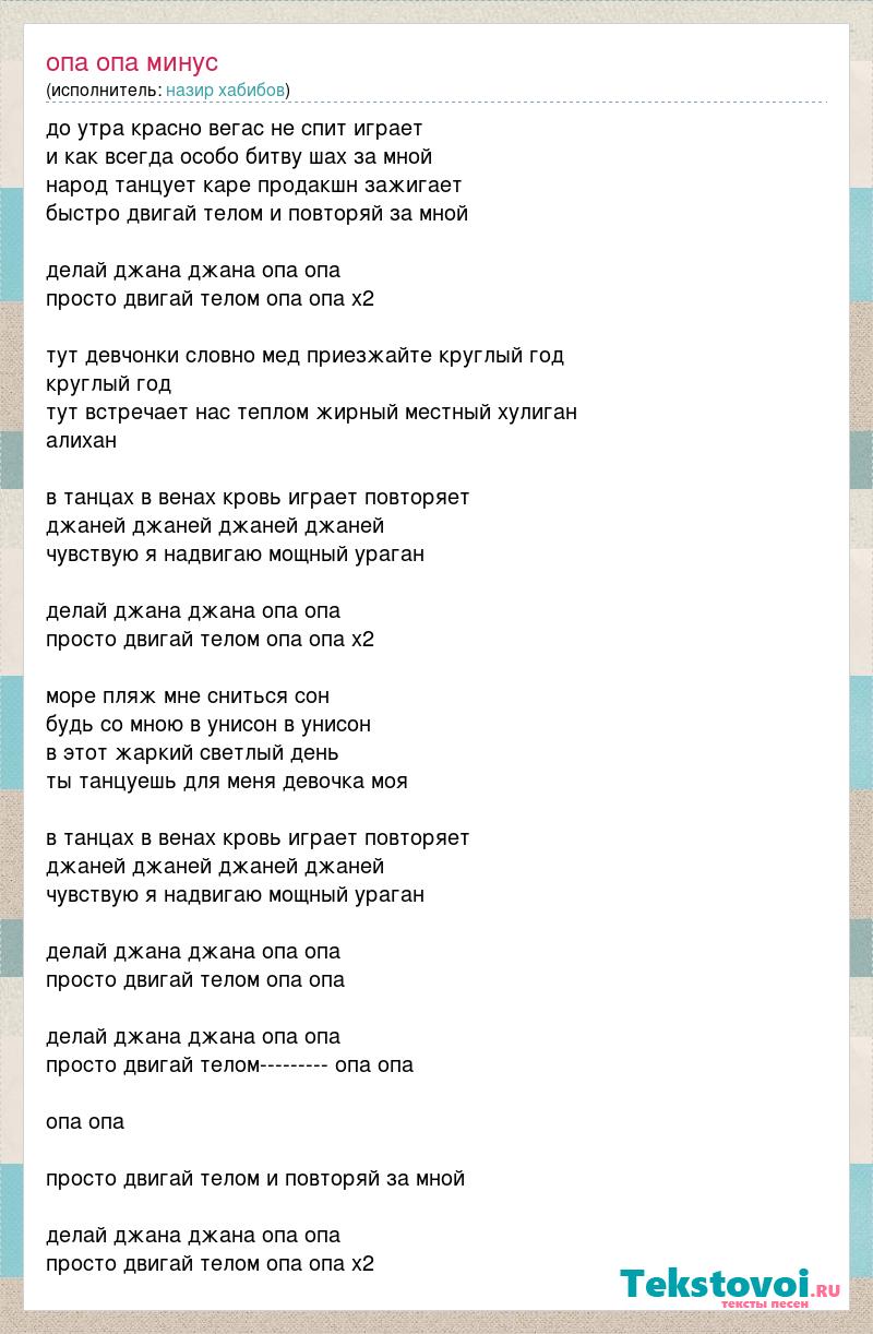 до утра красно вегас не спит играет и как всегда особо битву шах за мной народ танцует каре продакшн зажигает быстро двигай телом и повторяй за мной делай джана джана опа опа просто двигай телом опа опа х2 тут девчонки словно мед приезжайте круглый год круглый год тут встречает нас теплом жирный местный хулиган алихан в танцах в венах кровь играет повторяет джаней джаней джаней джаней чувствую я надвигаю мощный ураган делай джана джана опа опа просто двигай телом опа опа х2 море пляж мне сниться сон будь со мною в унисон в унисон в этот жаркий светлый день ты танцуешь для меня девочка моя в танцах в венах кровь играет повторяет джаней джаней джаней джаней чувствую я надвигаю мощный ураган делай джана джана опа опа просто двигай телом опа опа делай джана джана опа опа просто двигай телом--------- опа опа опа опа просто двигай телом и повторяй за мной делай джана джана опа опа просто двигай телом опа опа х2