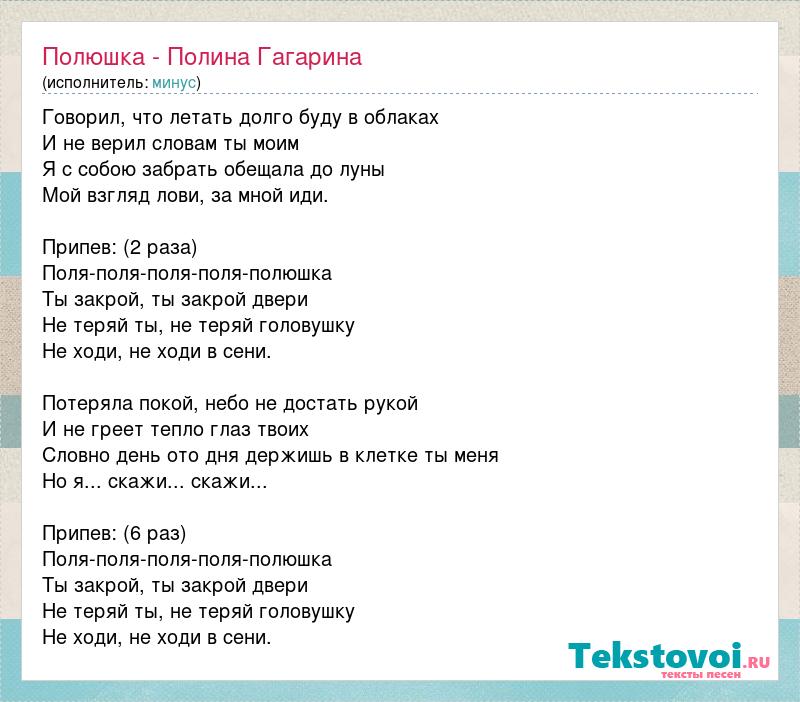 Говорил, что летать долго буду в облаках И не верил словам ты моим Я с собою забрать обещала до луны Мой взгляд лови, за мной иди. Припев: (2 раза) Поля-поля-поля-поля-полюшка Ты закрой, ты закрой двери Не теряй ты, не теряй головушку Не ходи, не ходи в сени. Потеряла покой, небо не достать рукой И не греет тепло глаз твоих Словно день ото дня держишь в клетке ты меня Но я... скажи... скажи... Припев: (6 раз) Поля-поля-поля-поля-полюшка Ты закрой, ты закрой двери Не теряй ты, не теряй головушку Не ходи, не ходи в сени.