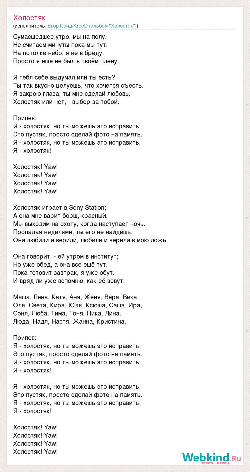 Сумасшедшее утро, мы на полу. Не считаем минуты пока мы тут. На потолке небо, я не в бреду. Просто я еще не был в твоём плену. Я тебя себе выдумал или ты есть? Ты так вкусно целуешь, что хочется съесть. Я закрою глаза, ты мне сделай любовь. Холостяк или нет, - выбор за тобой. Припев: Я - холостяк, но ты можешь это исправить. Это пустяк, просто сделай фото на память. Я - холостяк, но ты можешь это исправить. Я - холостяк! Холостяк! Yaw! Холостяк! Yaw! Холостяк! Yaw! Холостяк! Yaw! Холостяк играет в Sony Station; А она мне варит борщ, красный. Мы выходим на охоту, когда наступает ночь. Пропадая неделями, ты его не найдёшь. Они любили и верили, любили и верили в мою ложь. Она говорит, - ей утром в институт; Но уже обед, а она все ещё тут. Пока готовит завтрак, я уже обут. И вряд ли уже вспомню, как её зовут. Маша, Лена, Катя, Аня, Женя, Вера, Вика, Оля, Света, Кира, Юля, Ксюша, Саша, Ира, Соня, Люба, Тима, Тоня, Ника, Лина. Люда, Надя, Настя, Жанна, Кристина. Припев: Я - холостяк, но ты можешь это исправить. Это пустяк, просто сделай фото на память. Я - холостяк, но ты можешь это исправить. Я - холостяк! Я - холостяк, но ты можешь это исправить. Это пустяк, просто сделай фото на память. Я - холостяк, но ты можешь это исправить. Я - холостяк! Холостяк! Yaw! Холостяк! Yaw! Холостяк! Yaw! Холостяк! Yaw!