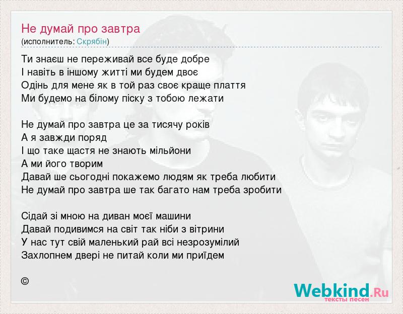 Ти знаєш не переживай все буде добре І навіть в іншому житті ми будем двоє Одінь для мене як в той раз своє краще плаття Ми будемо на білому піску з тобою лежати Не думай про завтра це за тисячу років А я завжди поряд І що таке щастя не знають мільйони А ми його творим Давай ше сьогодні покажемо людям як треба любити Не думай про завтра ше так багато нам треба зробити Сідай зі мною на диван моєї машини Давай подивимся на світ так ніби з вітрини У нас тут свій маленький рай всі незрозумілий Захлопнем двері не питай коли ми приїдем ©