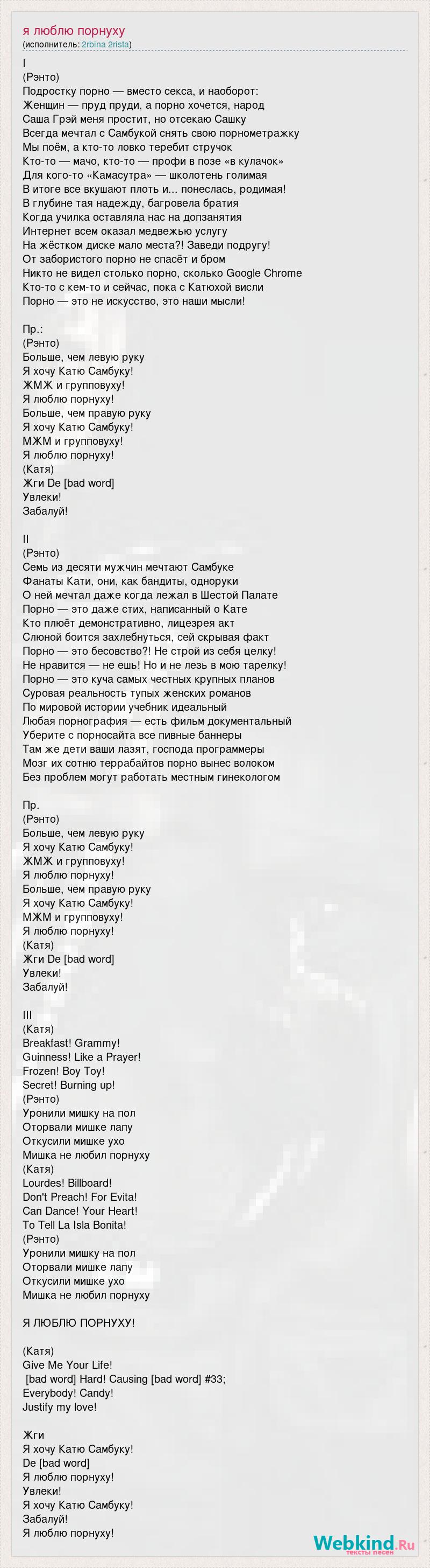 I (Рэнто) Подростку порно — вместо секса, и наоборот: Женщин — пруд пруди, а порно хочется, народ Саша Грэй меня простит, но отсекаю Сашку Всегда мечтал с Самбукой снять свою порнометражку Мы поём, а кто-то ловко теребит стручок Кто-то — мачо, кто-то — профи в позе «в кулачок» Для кого-то «Камасутра» — школотень голимая В итоге все вкушают плоть и... понеслась, родимая! В глубине тая надежду, багровела братия Когда училка оставляла нас на допзанятия Интернет всем оказал медвежью услугу На жёстком диске мало места?! Заведи подругу! От забористого порно не спасёт и бром Никто не видел столько порно, сколько Google Chrome Кто-то с кем-то и сейчас, пока с Катюхой висли Порно — это не искусство, это наши мысли! Пр.: (Рэнто) Больше, чем левую руку Я хочу Катю Самбуку! ЖМЖ и групповуху! Я люблю порнуху! Больше, чем правую руку Я хочу Катю Самбуку! МЖМ и групповуху! Я люблю порнуху! (Катя) Жги De [bad word] Увлеки! Забалуй! II (Рэнто) Семь из десяти мужчин мечтают Самбуке Фанаты Кати, они, как бандиты, одноруки О ней мечтал даже когда лежал в Шестой Палате Порно — это даже стих, написанный о Кате Кто плюёт демонстративно, лицезрея акт Слюной боится захлебнуться, сей скрывая факт Порно — это бесовство?! Не строй из себя целку! Не нравится — не ешь! Но и не лезь в мою тарелку! Порно — это куча самых честных крупных планов Суровая реальность тупых женских романов По мировой истории учебник идеальный Любая порнография — есть фильм документальный Уберите с порносайта все пивные баннеры Там же дети ваши лазят, господа программеры Мозг их сотню террабайтов порно вынес волоком Без проблем могут работать местным гинекологом Пр. (Рэнто) Больше, чем левую руку Я хочу Катю Самбуку! ЖМЖ и групповуху! Я люблю порнуху! Больше, чем правую руку Я хочу Катю Самбуку! МЖМ и групповуху! Я люблю порнуху! (Катя) Жги De [bad word] Увлеки! Забалуй! III (Катя) Breakfast! Grammy! Guinness! Like a Prayer! Frozen! Boy Toy! Secret! Burning up! (Рэнто) Уронили мишку на пол Оторвали мишке лапу Откусили мишке ухо Мишка не любил порнуху (Катя) Lourdes! Billboard! Don't Preach! For Evita! Can Dance! Your Heart! To Tell La Isla Bonita! (Рэнто) Уронили мишку на пол Оторвали мишке лапу Откусили мишке ухо Мишка не любил порнуху Я ЛЮБЛЮ ПОРНУХУ! (Катя) Give Me Your Life! [bad word] Hard! Causing [bad word] #33; Everybody! Candy! Justify my love! Жги Я хочу Катю Самбуку! De [bad word] Я люблю порнуху! Увлеки! Я хочу Катю Самбуку! Забалуй! Я люблю порнуху!