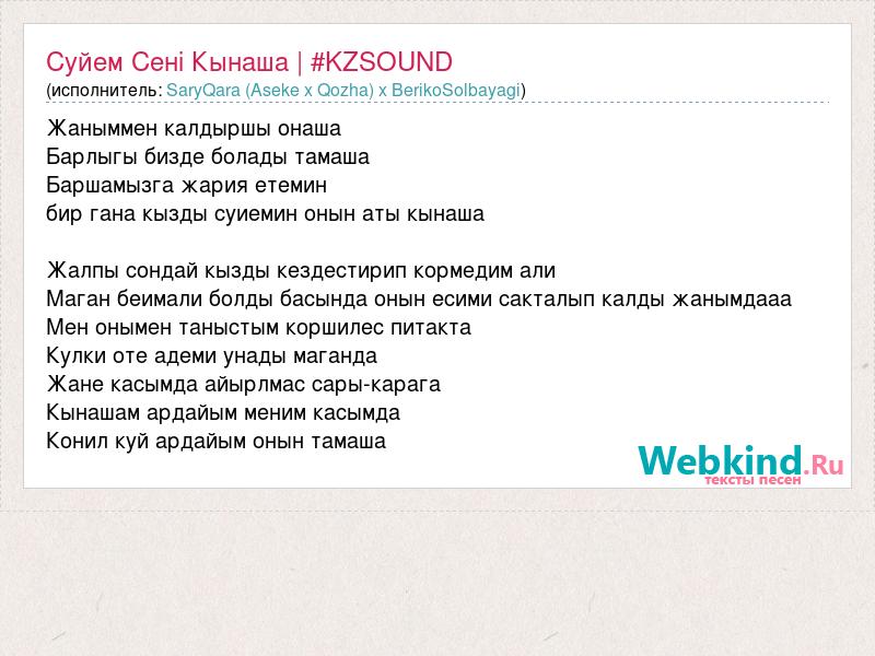 Жаныммен калдыршы онаша Барлыгы бизде болады тамаша Баршамызга жария етемин бир гана кызды суиемин онын аты кынаша Жалпы сондай кызды кездестирип кормедим али Маган беимали болды басында онын есими сакталып калды жанымдааа Мен онымен таныстым коршилес питакта Кулки оте адеми унады маганда Жане касымда айырлмас сары-карага Кынашам ардайым меним касымда Конил куй ардайым онын тамаша